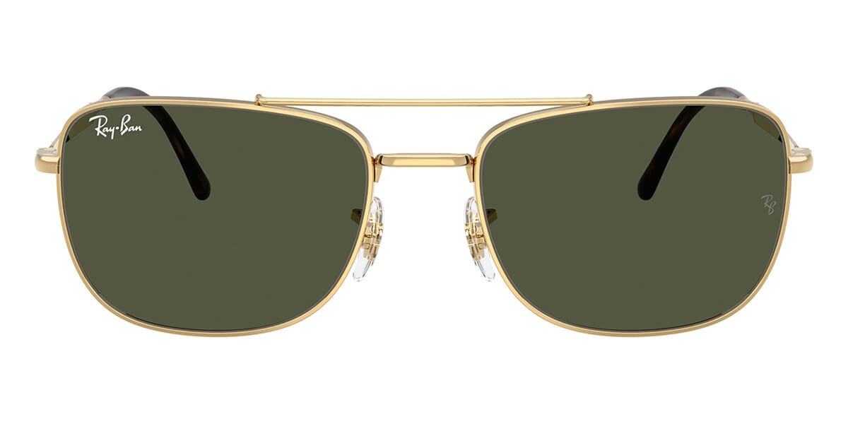 This rectangular Ray-Ban sunglass comes in a arista gold frame with green lenses.