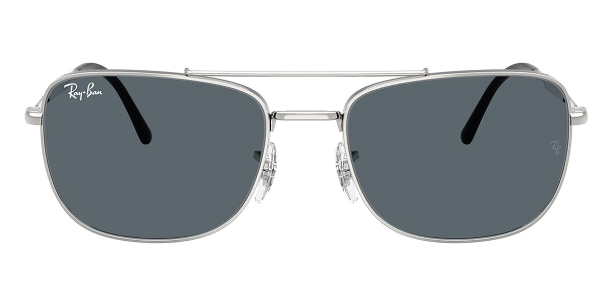 This rectangular Ray-Ban sunglass comes in a silver frame with blue lenses.