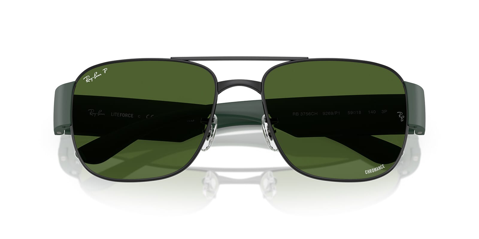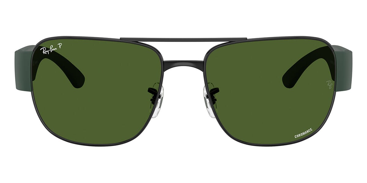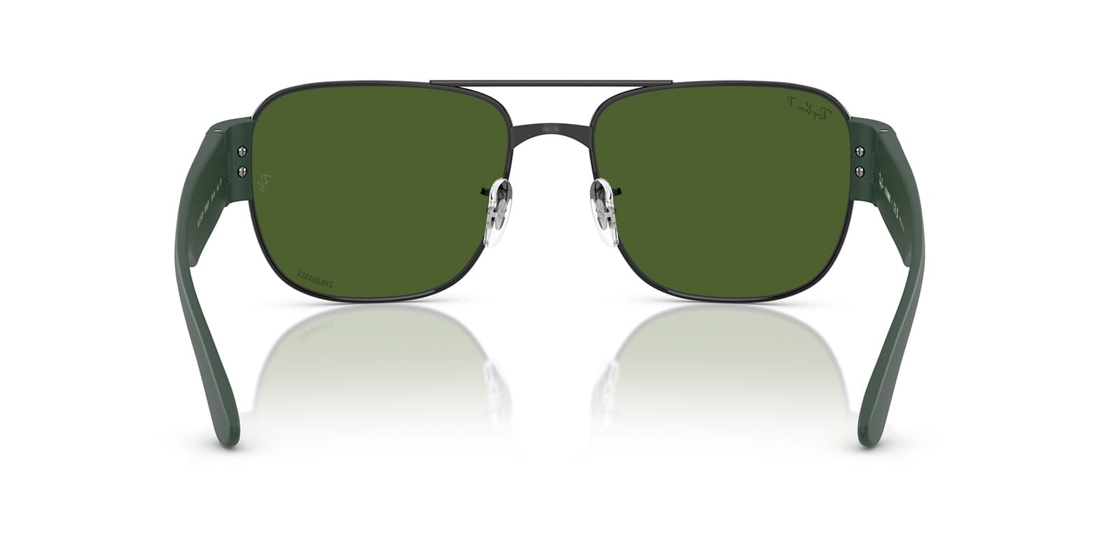 This square Ray-Ban sunglass comes in a black frame with dark green polarised lenses.