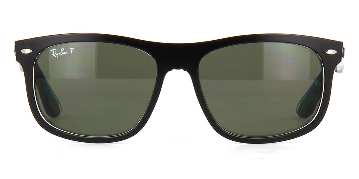 This rectangular Ray-Ban sunglass comes in a top matte black on transparent frame with green polar lenses.