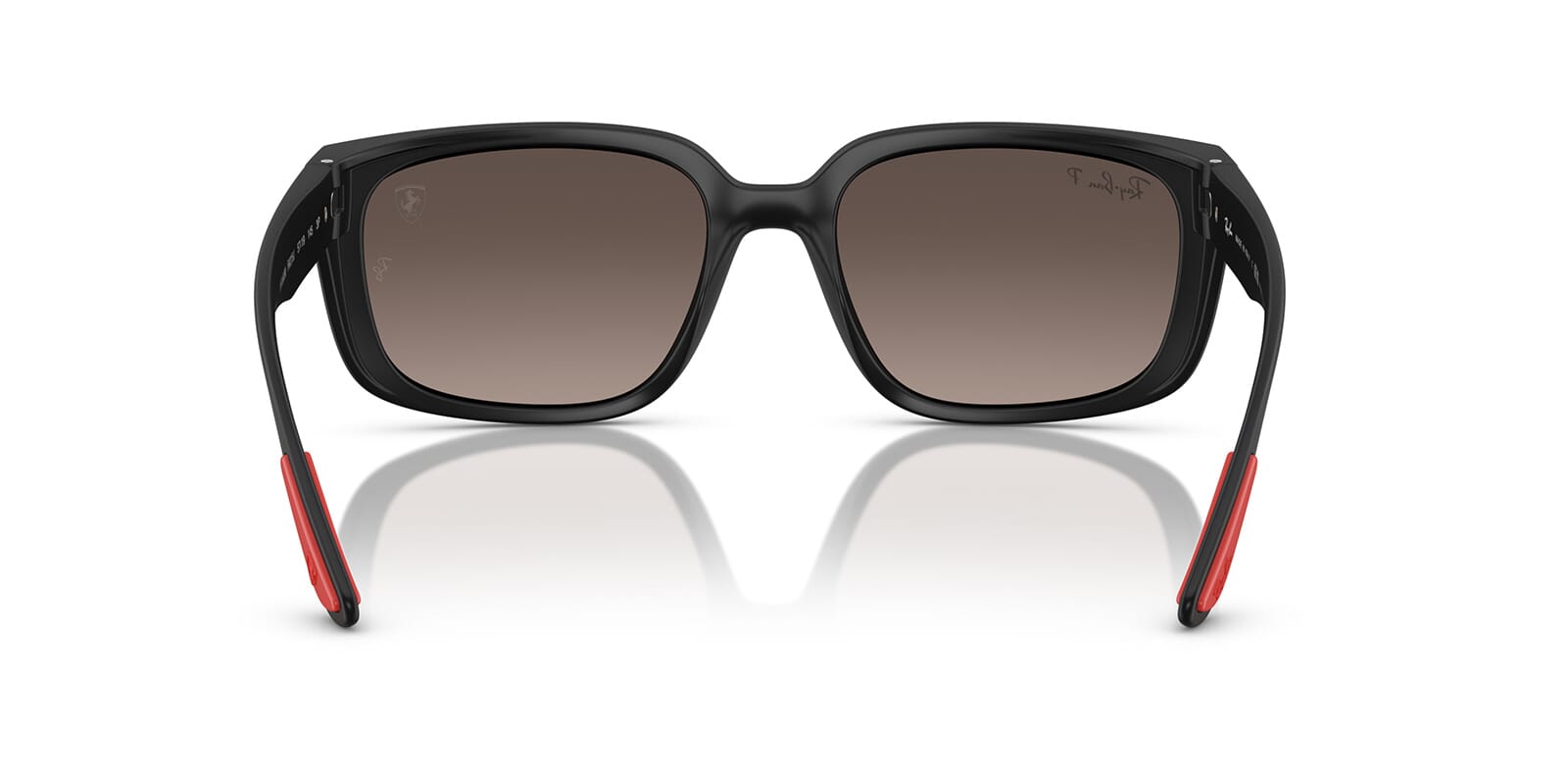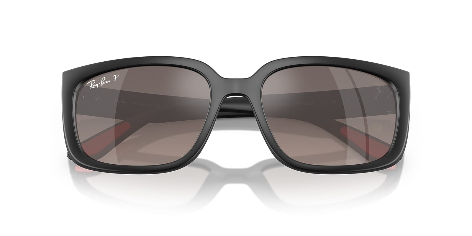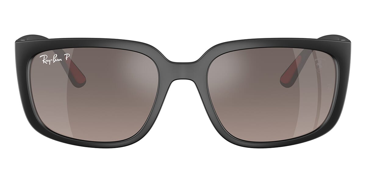 This square Ray-Ban sunglass comes in a matte black frame with brown with grey mirror polarised lenses.