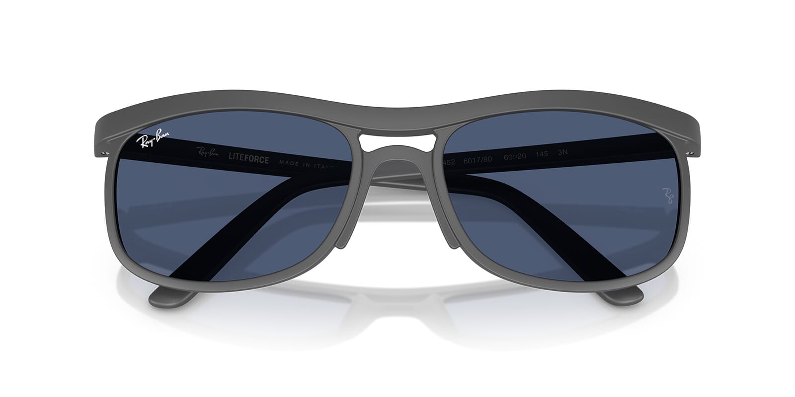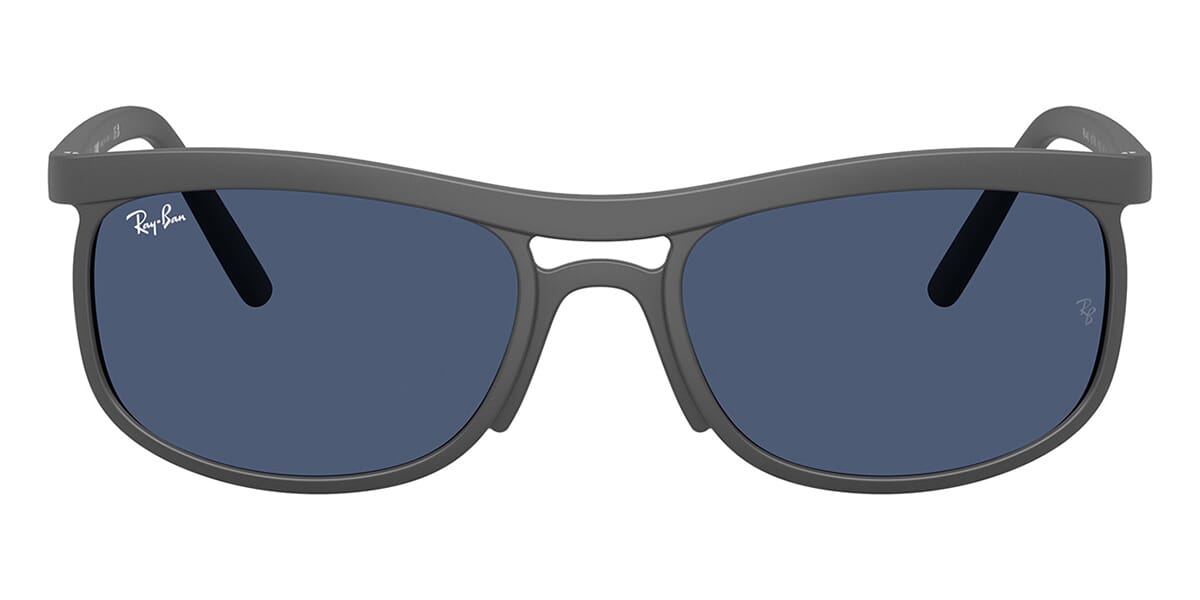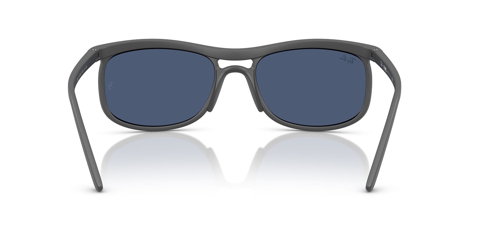 This square Ray-Ban sunglass comes in a sand grey frame with dark blue lenses.