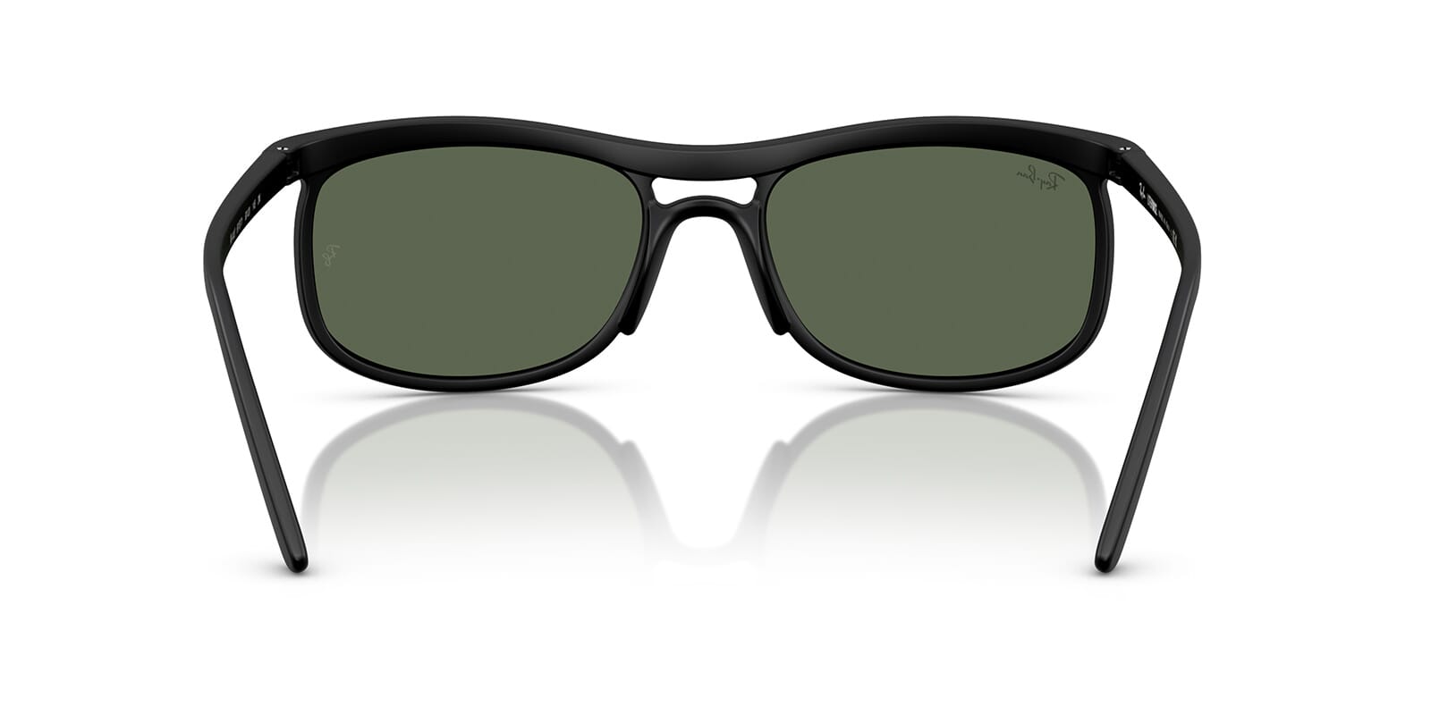 This square Ray-Ban sunglass comes in a sand black frame with dark green lenses.