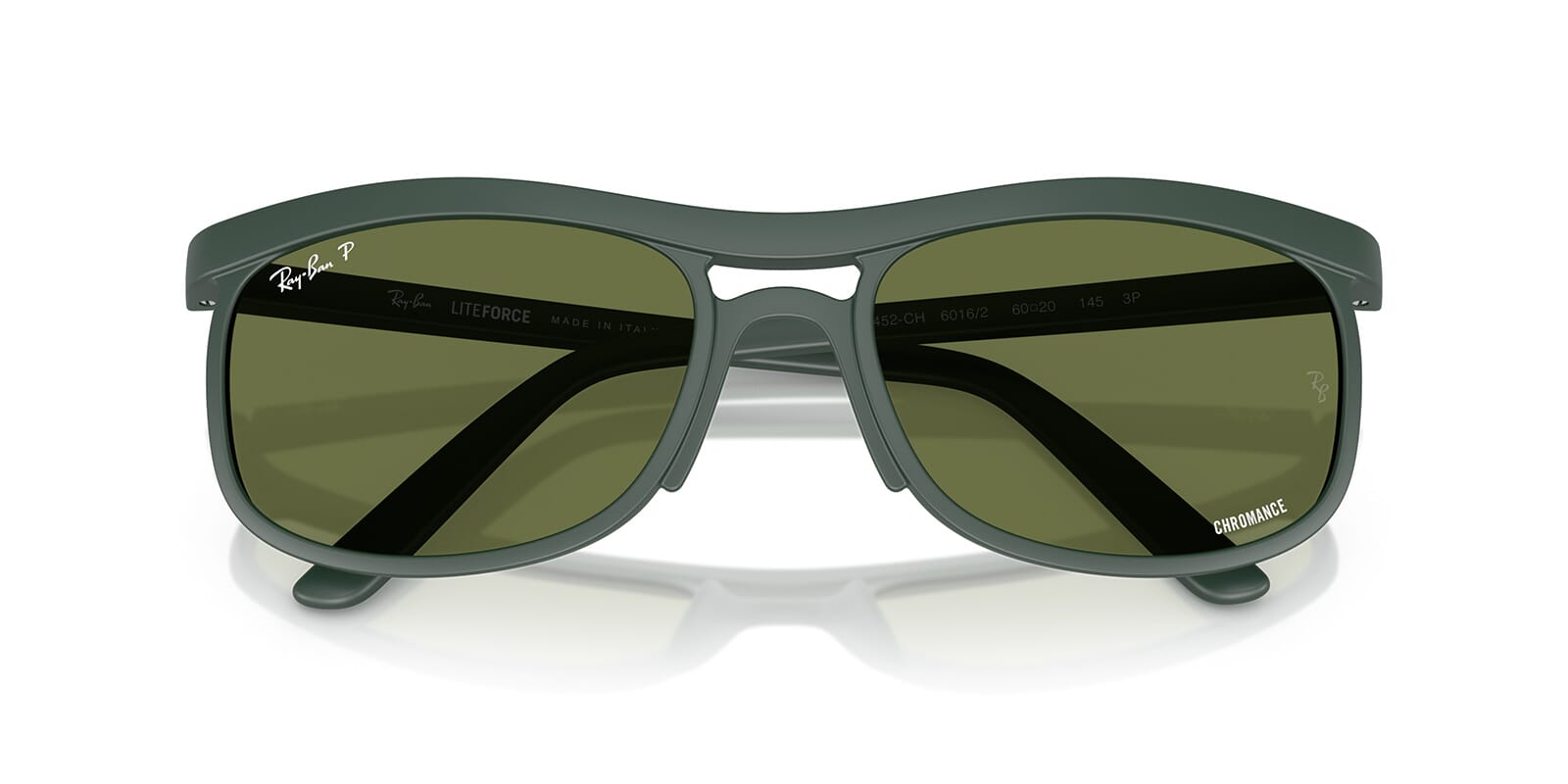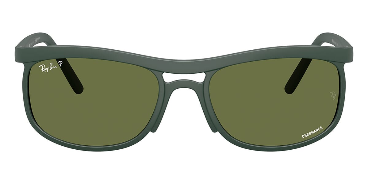 This square Ray-Ban sunglass comes in a sand green frame with green chromance lenses.