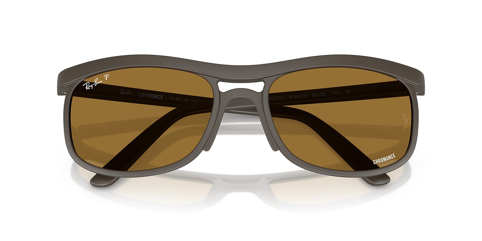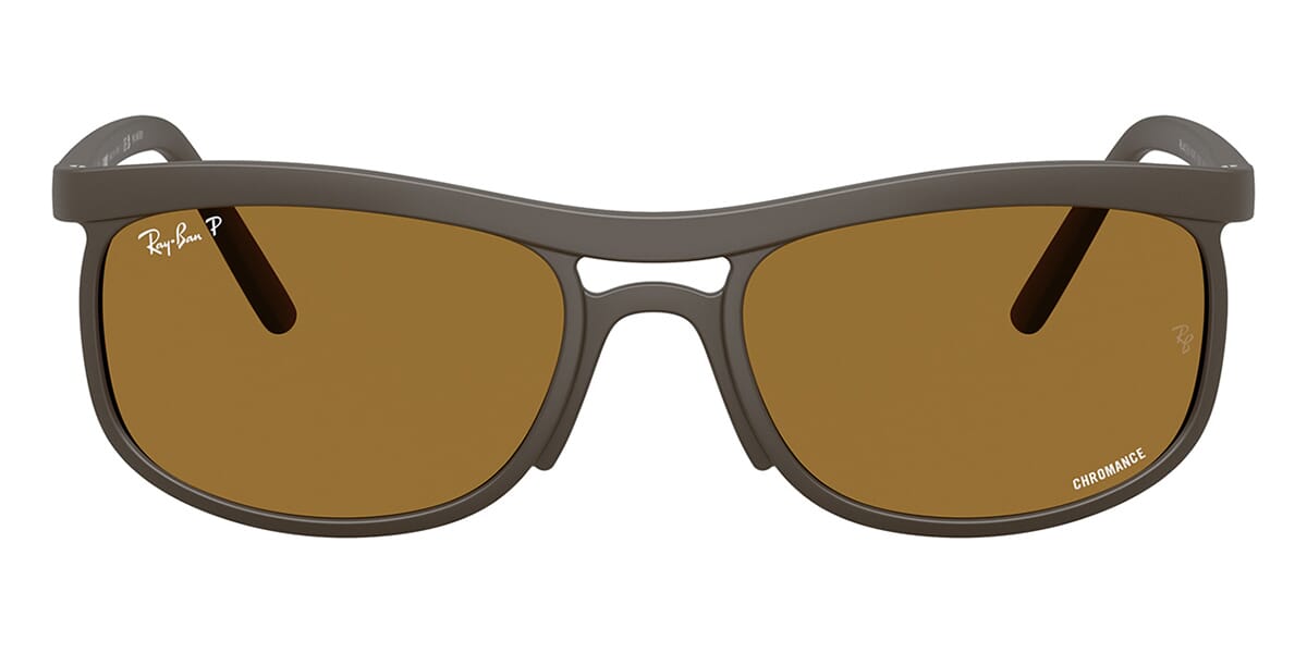 This square Ray-Ban sunglass comes in a sand brown frame with brown chromance lenses.