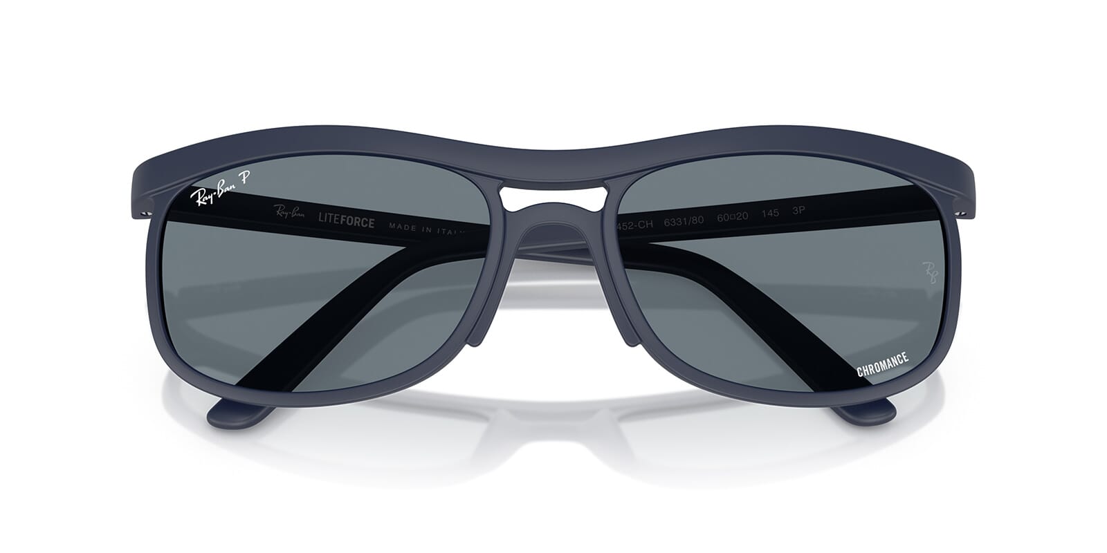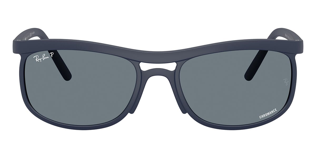 This square Ray-Ban sunglass comes in a sand dark blue frame with blue chromance lenses.
