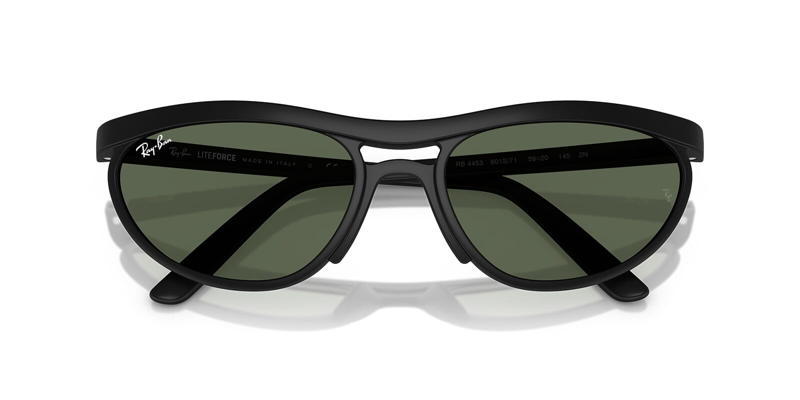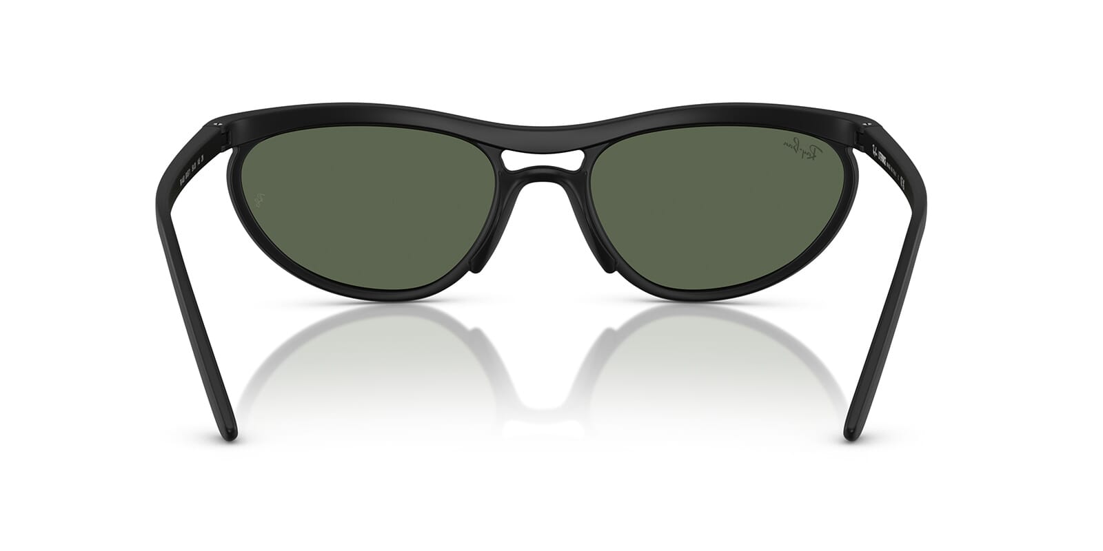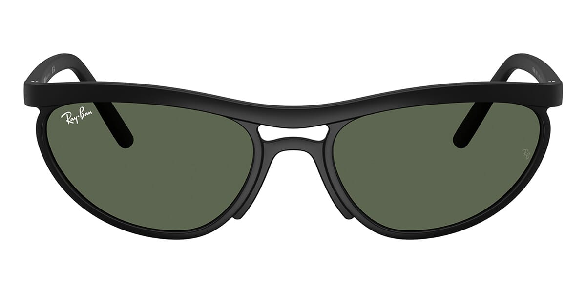 This cat eye Ray-Ban sunglass comes in a sand black frame with dark green lenses.