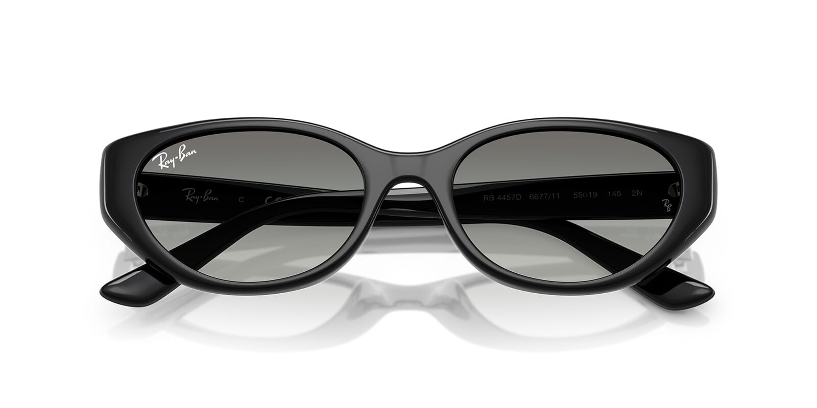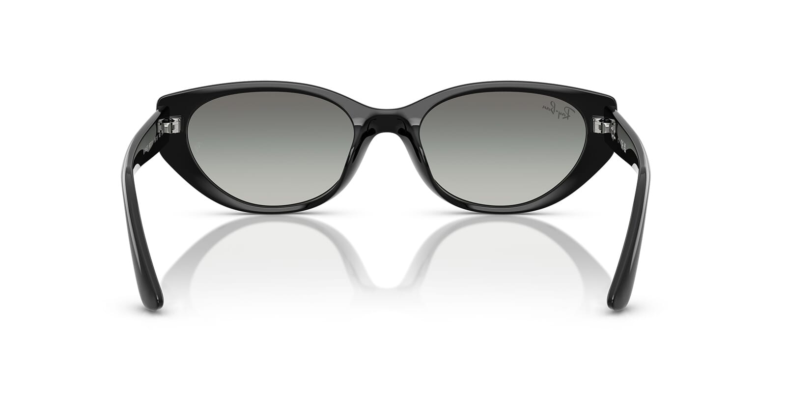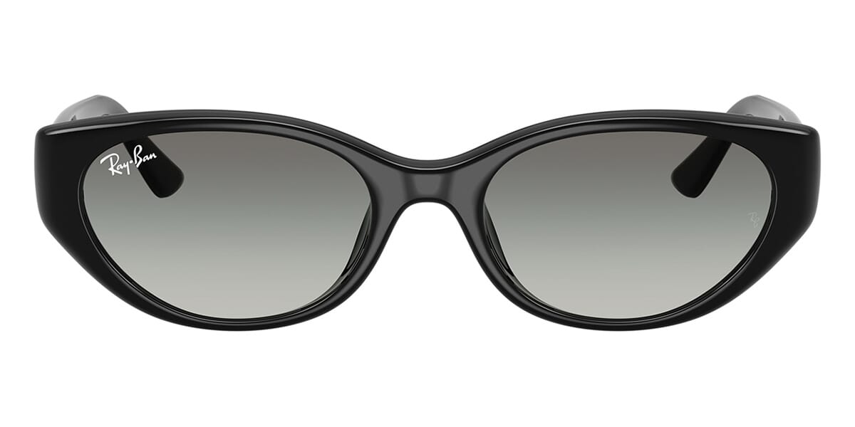 This round Ray-Ban sunglass comes in a black frame with grey gradient lenses.