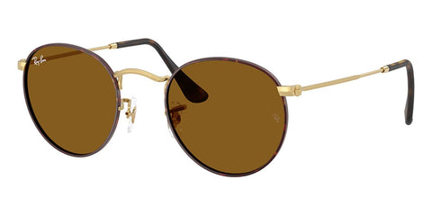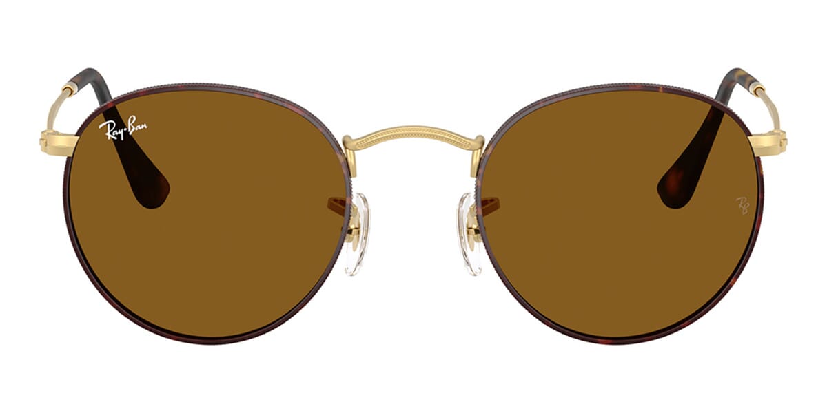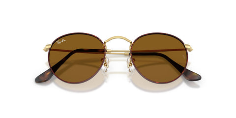 This round Ray-Ban sunglass comes in a matte havana on matte arista gold frame with brown lenses.