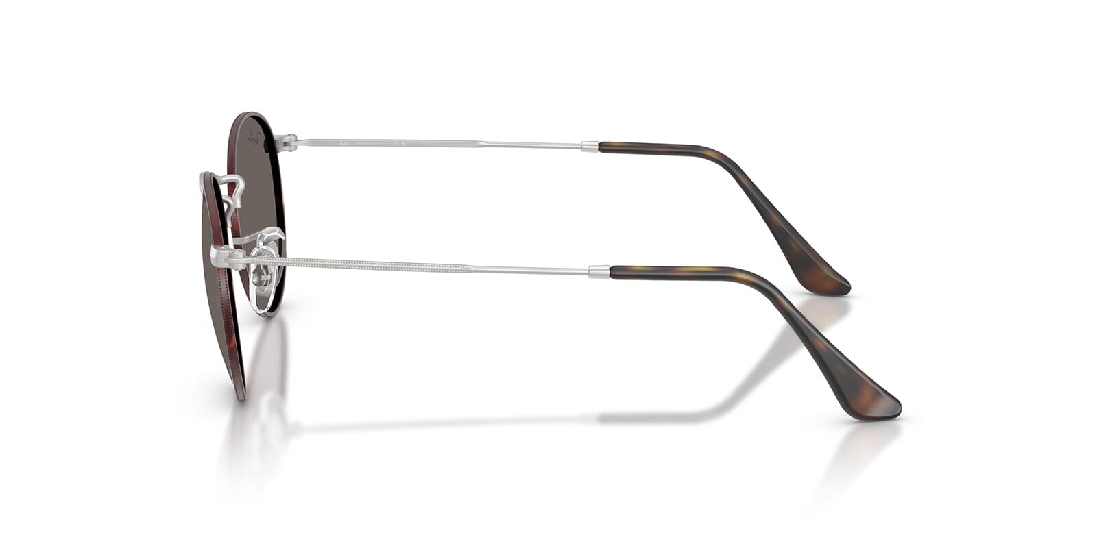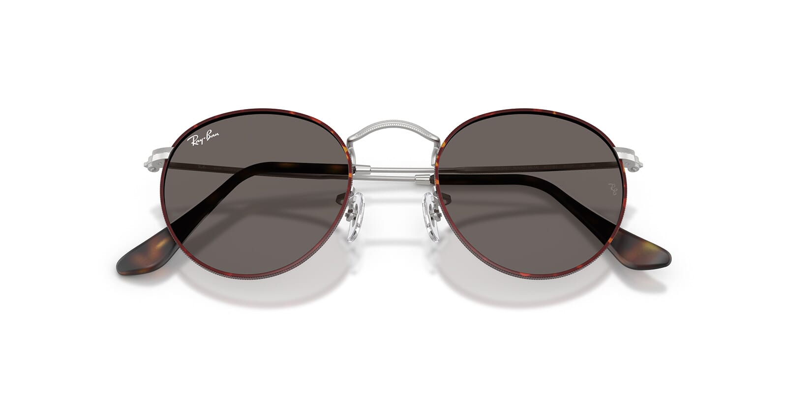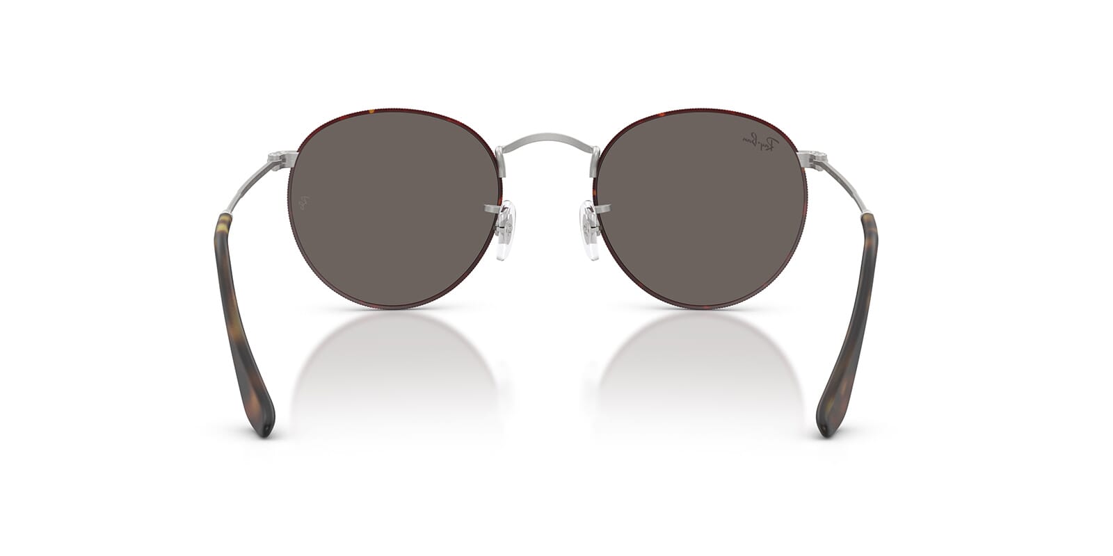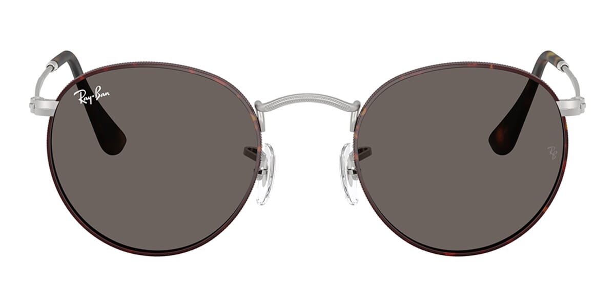 This round Ray-Ban sunglass comes in a matte havana on matte silver frame with dark grey lenses.