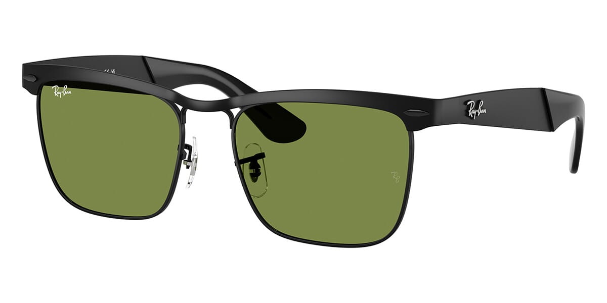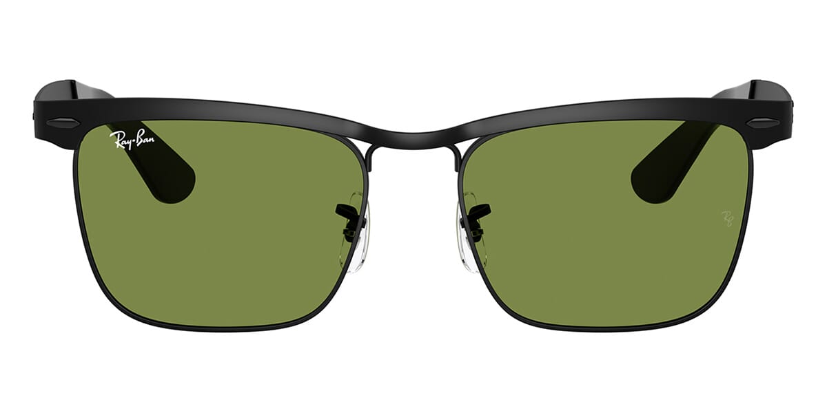 This square Ray-Ban sunglass comes in a matte black frame with green lenses.