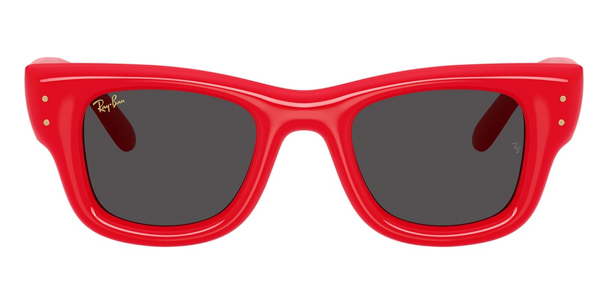 This square Ray-Ban sunglass comes in a red frame with ultra black lenses.