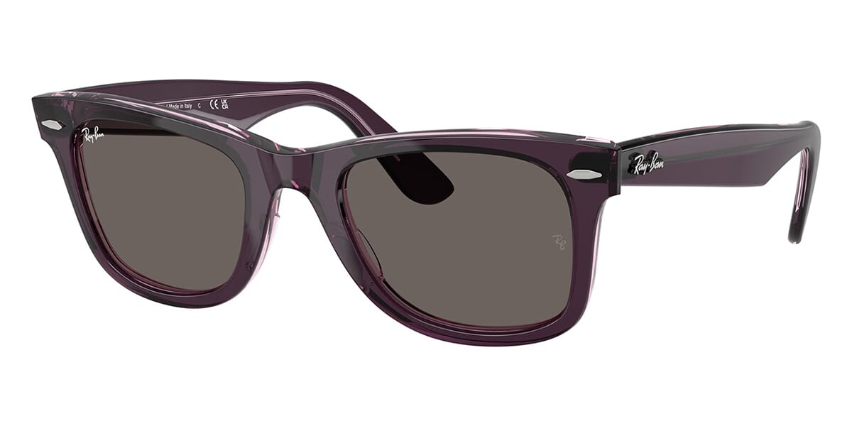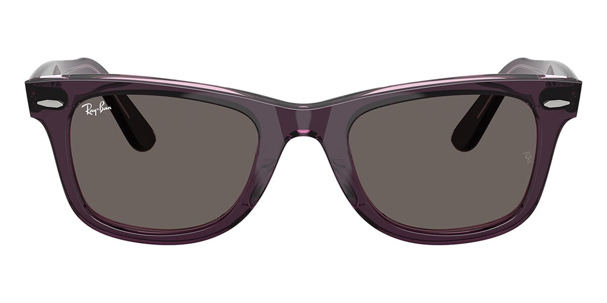 This square Ray-Ban sunglass comes in a violet on pink crystal frame with dark grey lenses.