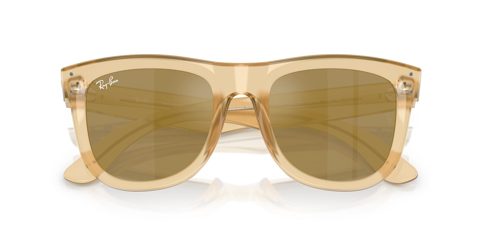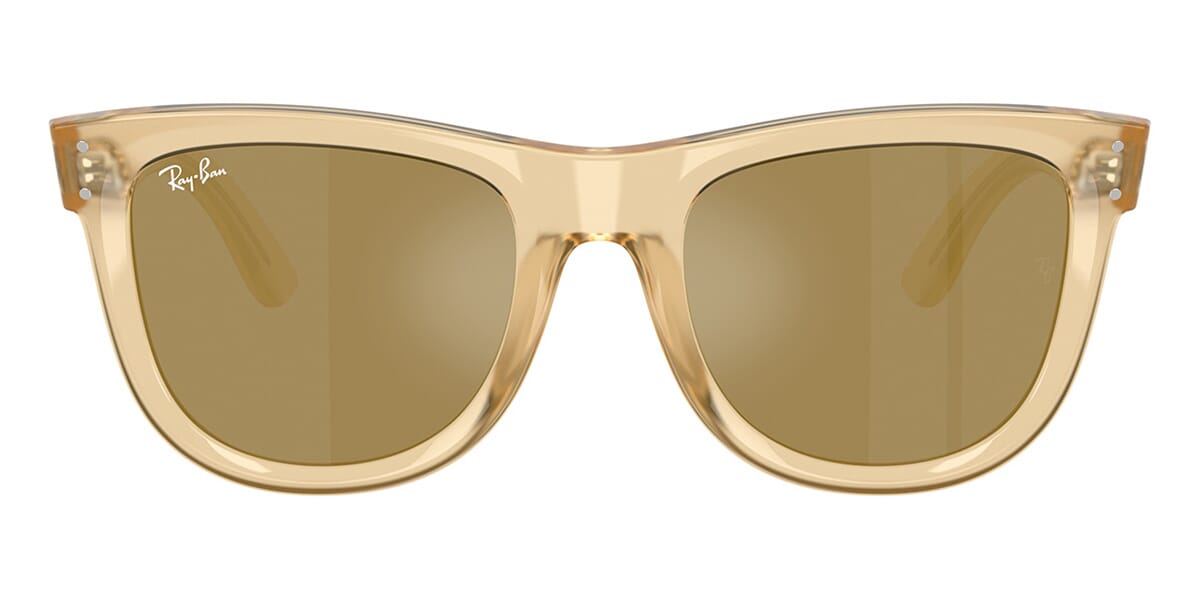This square Ray-Ban sunglass comes in a opal yellow frame with brown with gold mirror lenses.