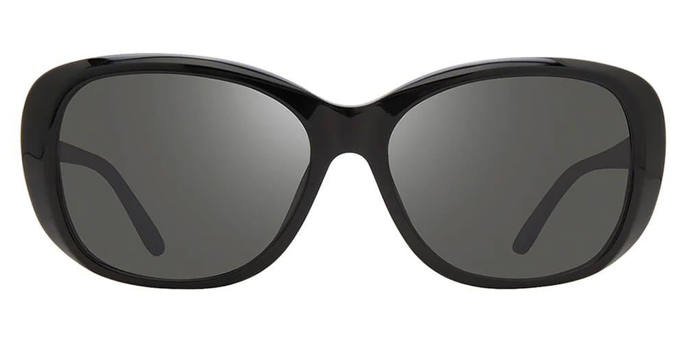 This square Revo sunglass comes in a shiny black frame with grey with light mirror polarised lenses.