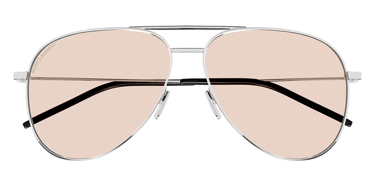 This aviator Saint Laurent sunglass comes in a silver frame with very light brown lenses.