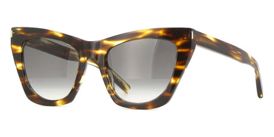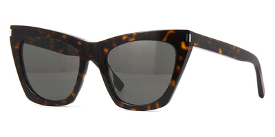 This cat eye Saint Laurent sunglass comes in a black and havana frame with grey smoke lenses.
