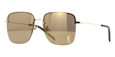 This square Saint Laurent sunglass comes in a gold frame with brown gradient lenses.