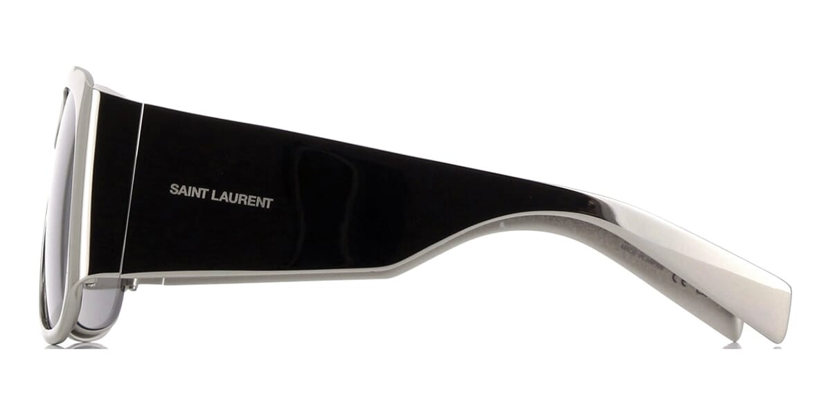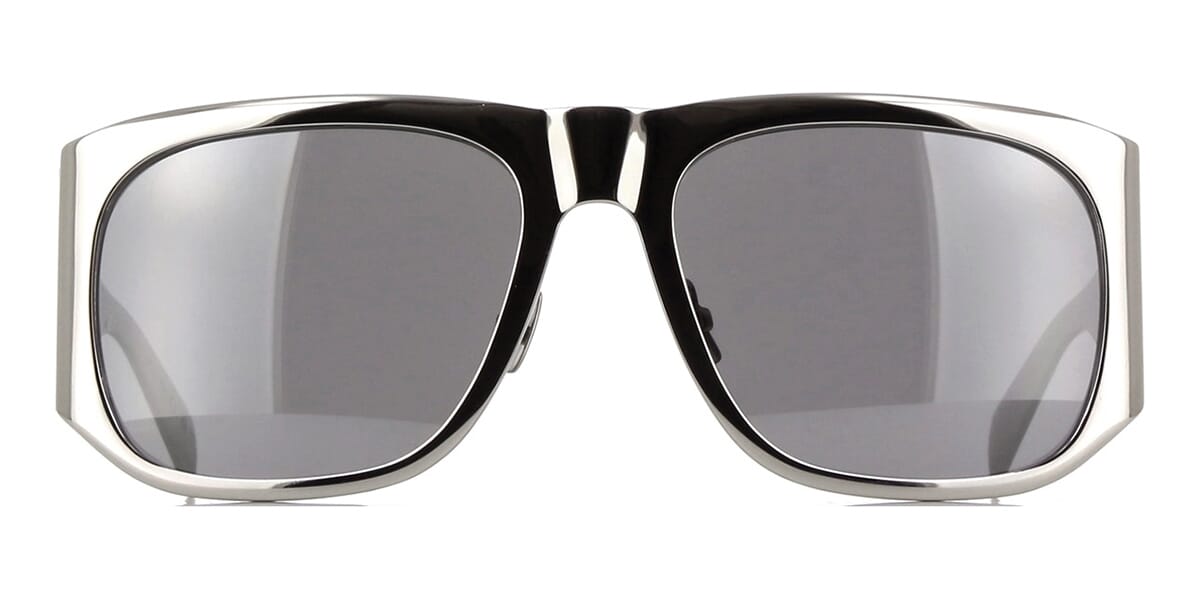 This square Saint Laurent sunglass comes in a shiny silver frame with grey with light silver mirror lenses.