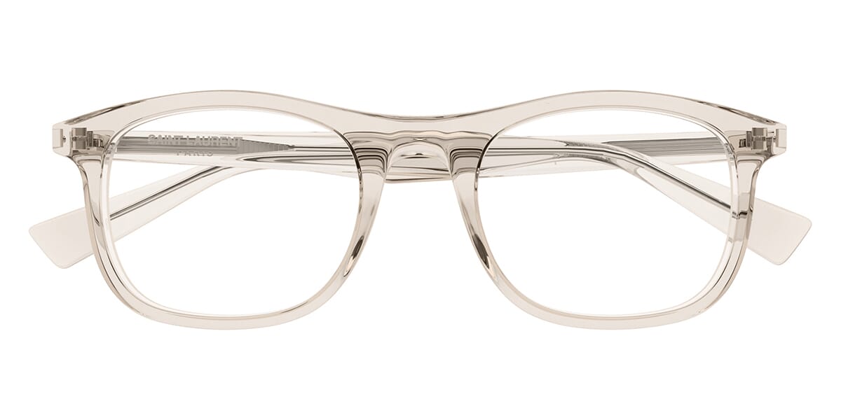 This square Saint Laurent optical comes in a shiny beige crystal frame.