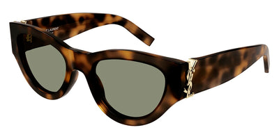 This cat eye Saint Laurent sunglass comes in a dark havana frame with green lenses.