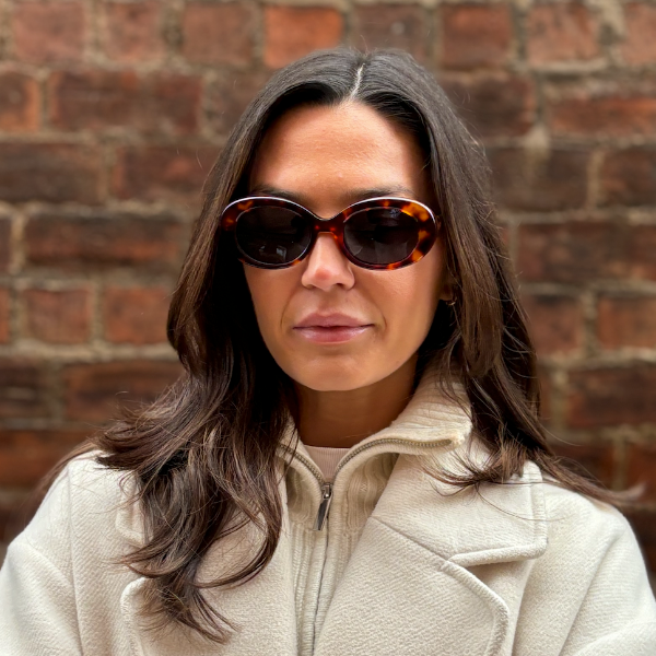 This cat eye Seeing Society sunglass comes in a shiny dark spotted havana frame with grey with light mirror polarised lenses.