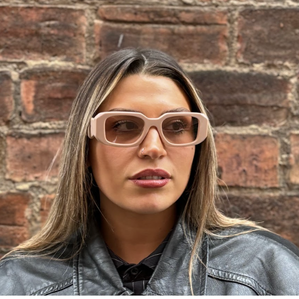 This square Seeing Society sunglass comes in a shiny soft pink frame with light brown polarised lenses.