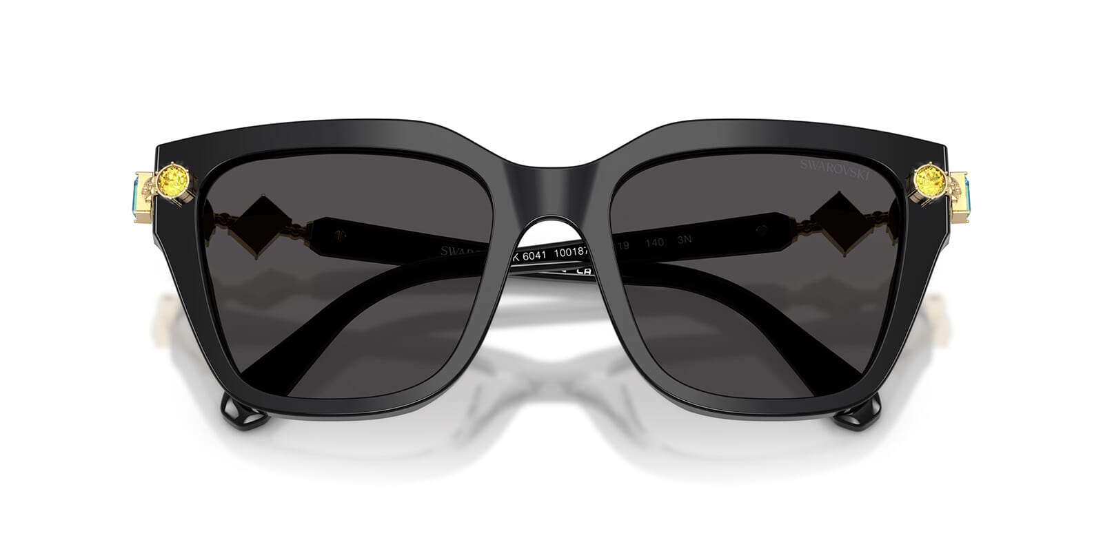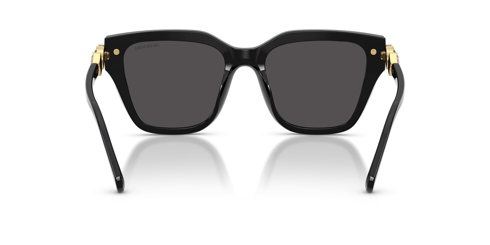 This square Swarovski sunglass comes in a black frame with dark grey lenses.