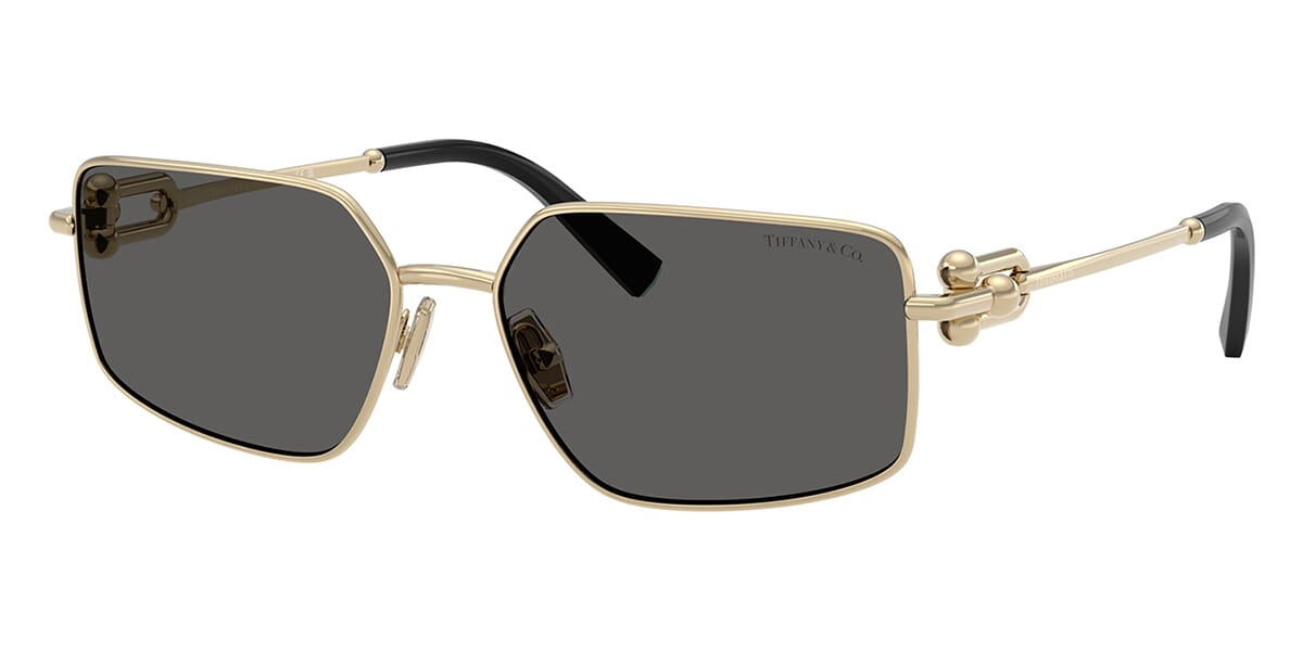 This rectangular Tiffany sunglass comes in a pale gold frame with dark grey lenses.