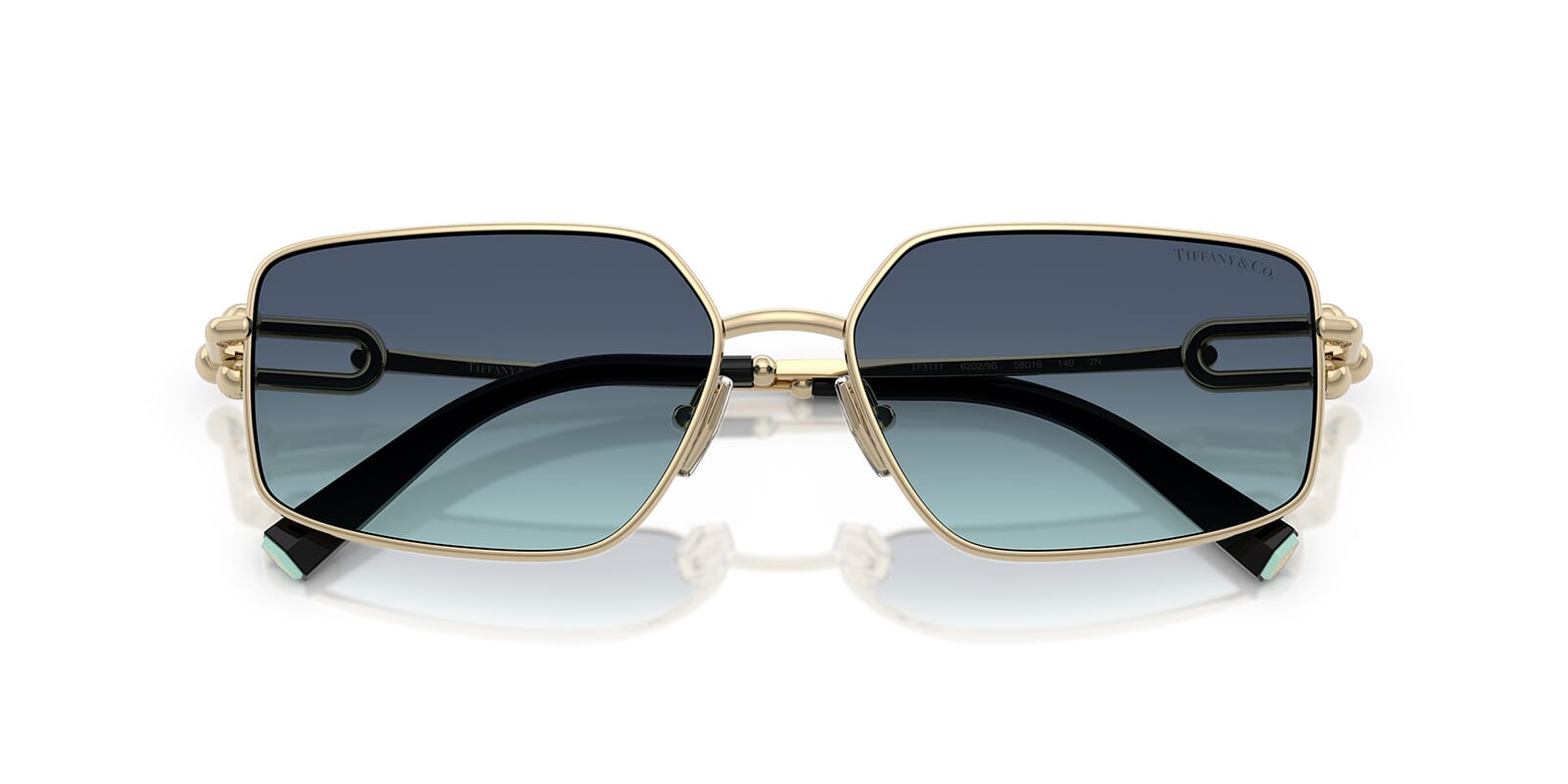 This rectangular Tiffany sunglass comes in a pale gold frame with azure blue gradient lenses.