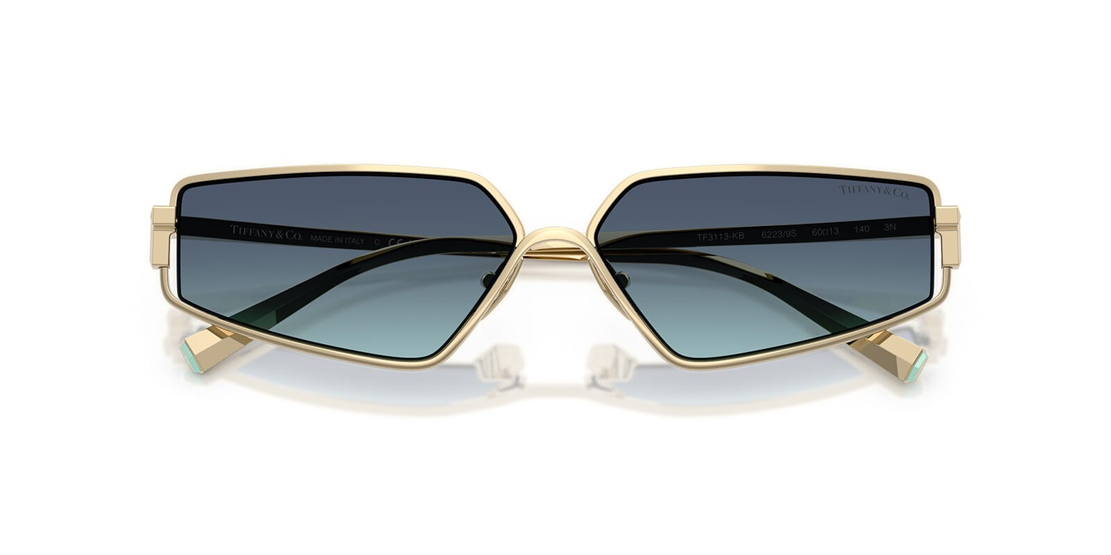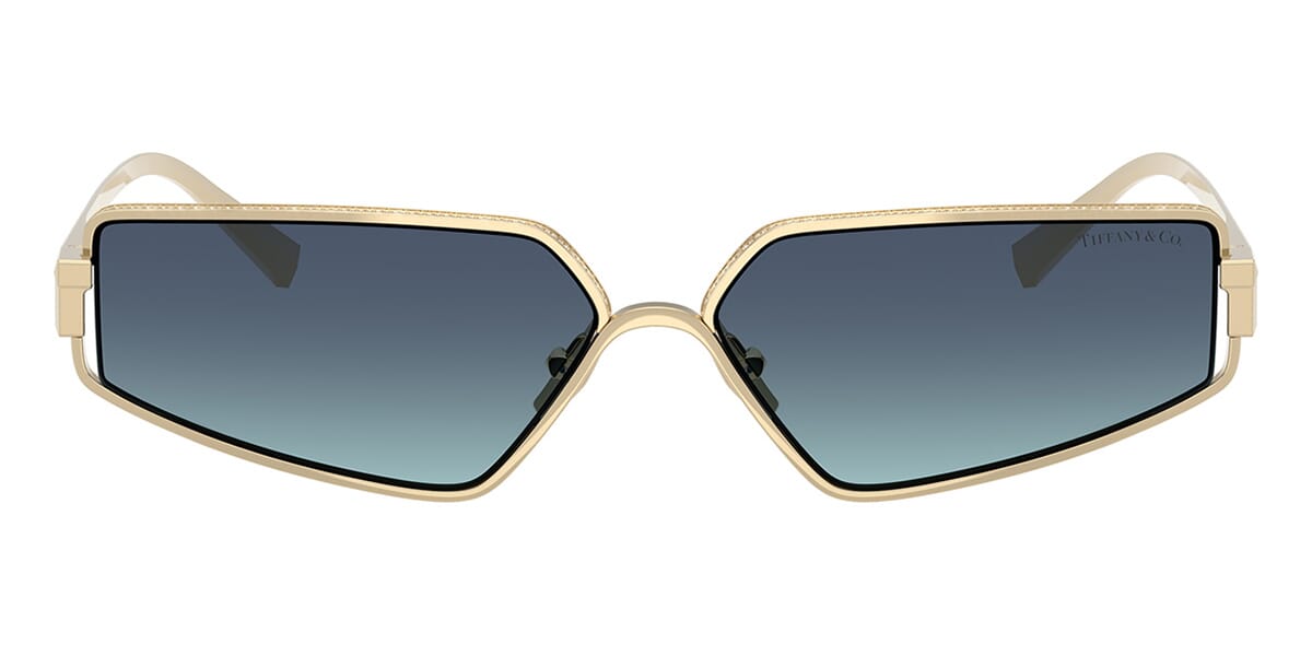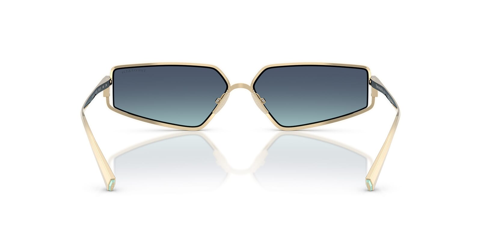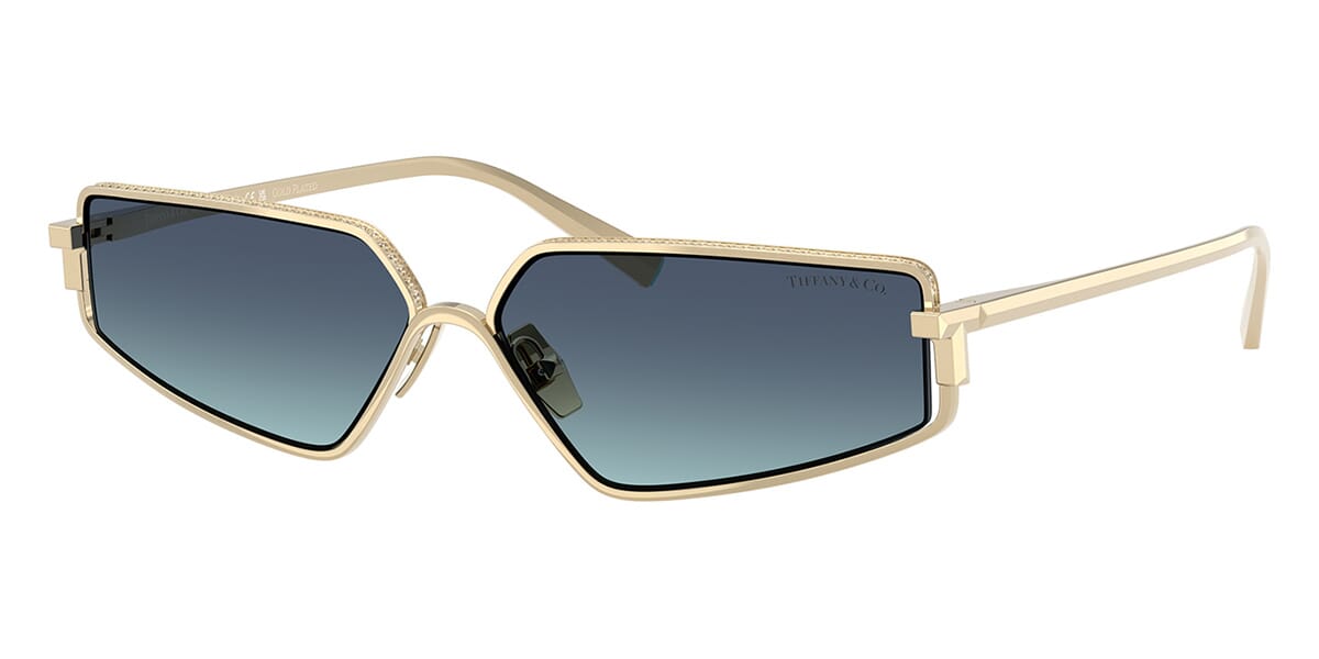 This rectangular Tiffany sunglass comes in a pale gold plated frame with azure blue gradient lenses.