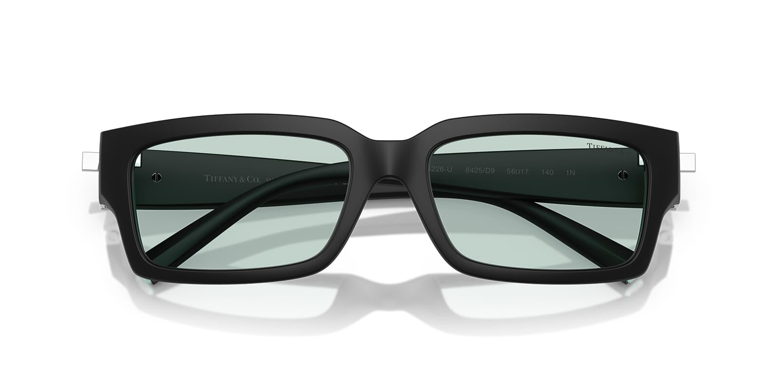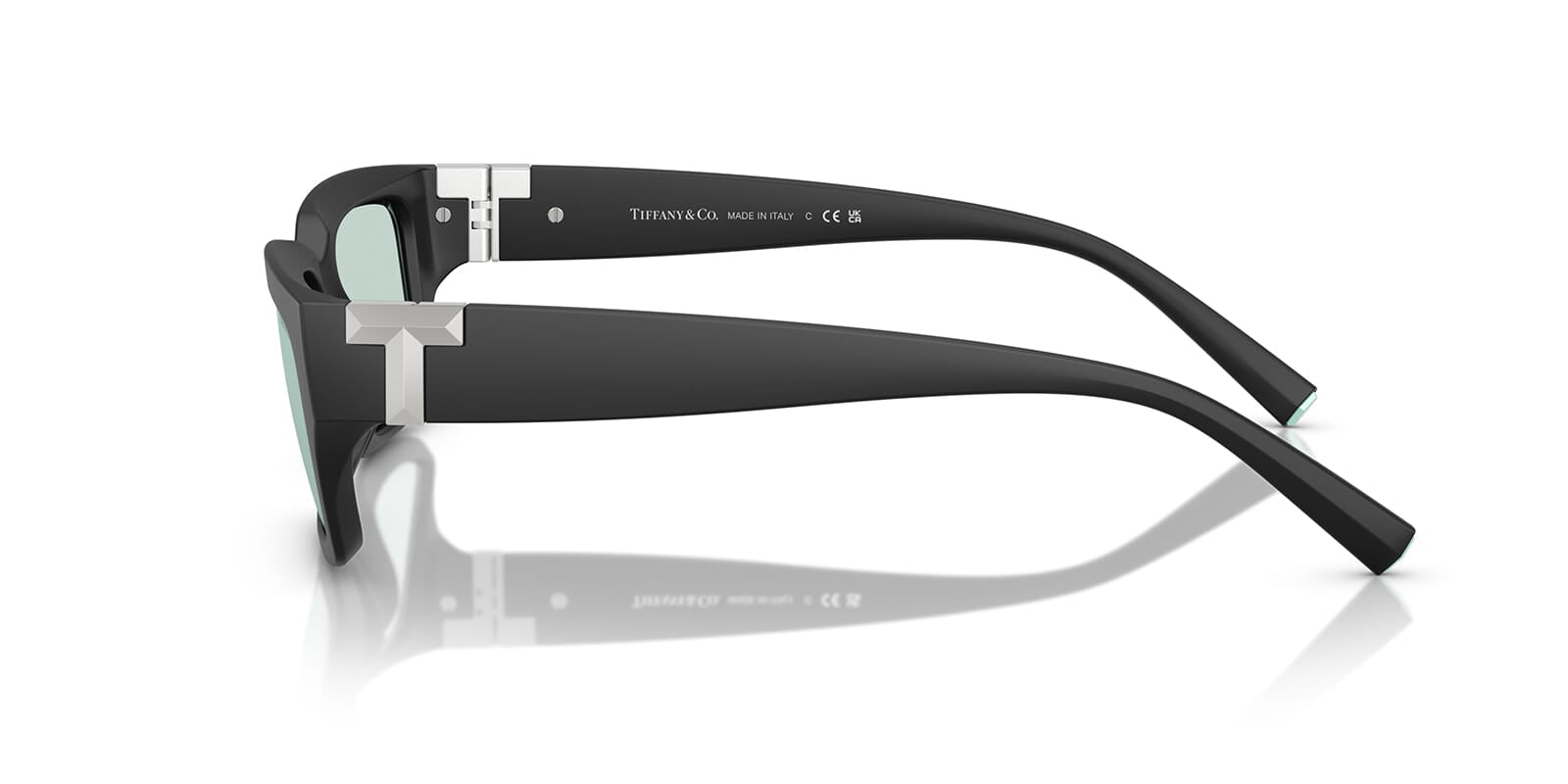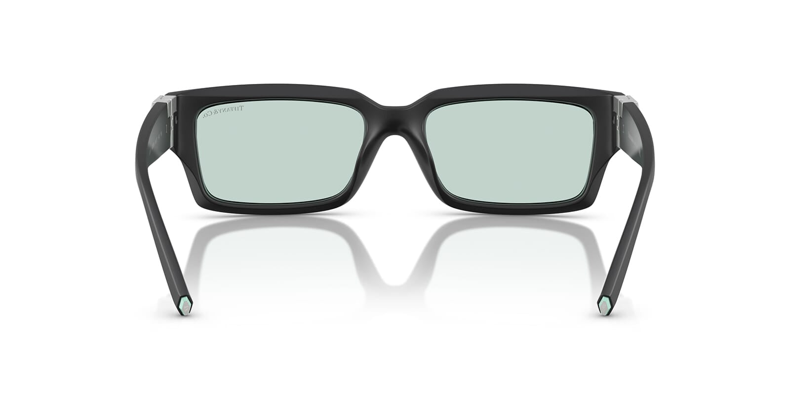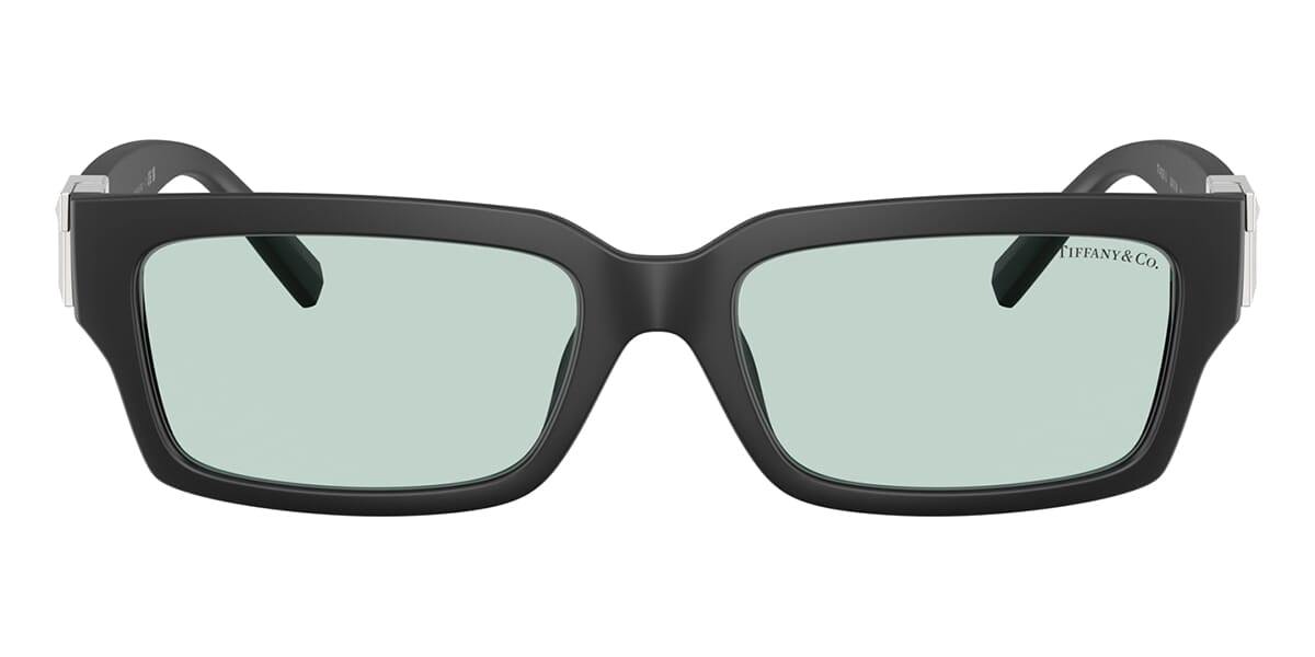 This rectangular Tiffany sunglass comes in a matte black frame with light azure lenses.