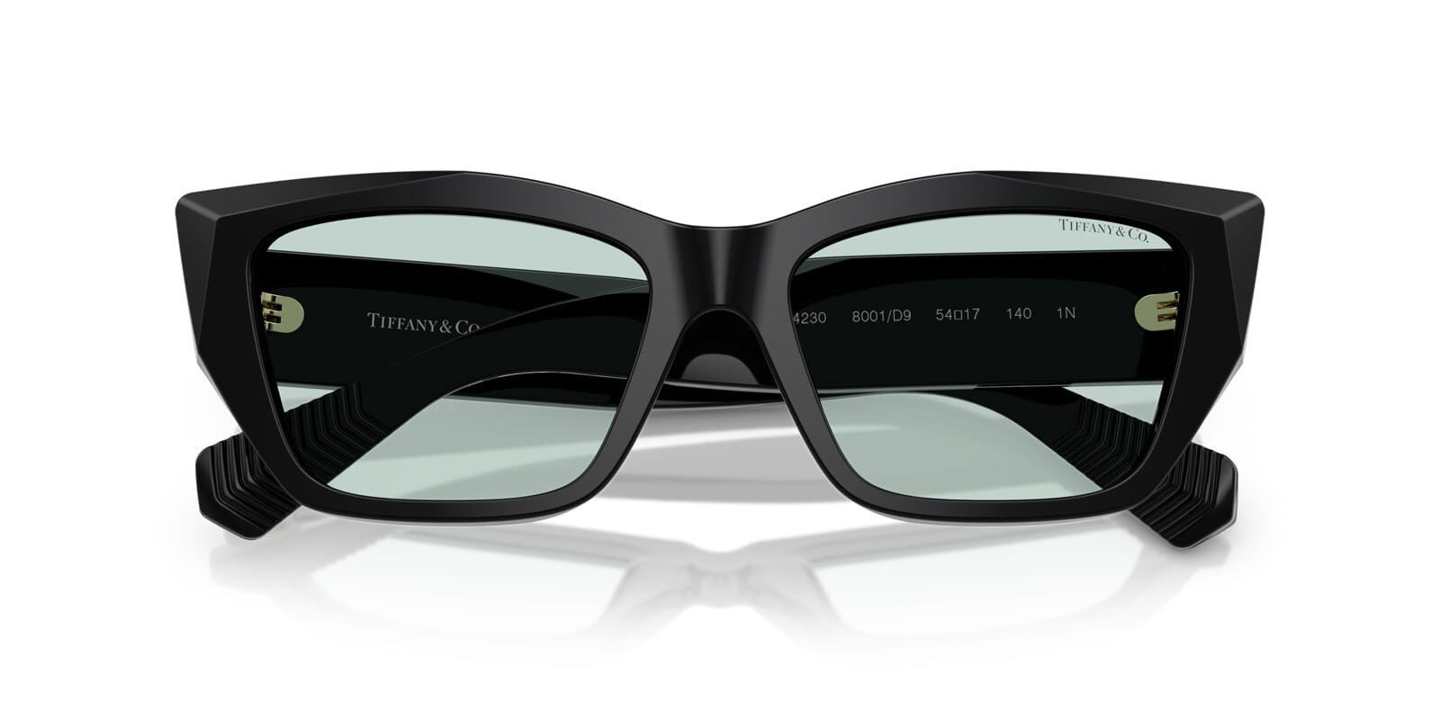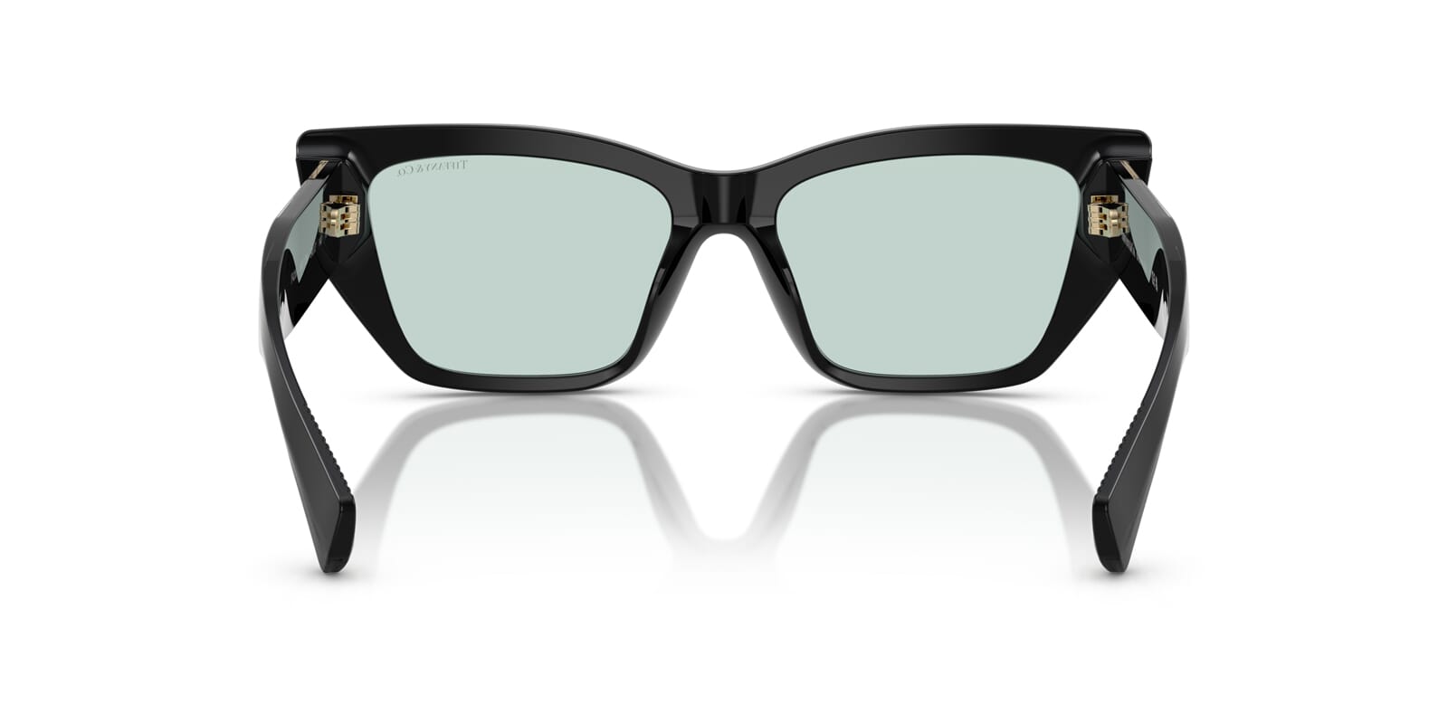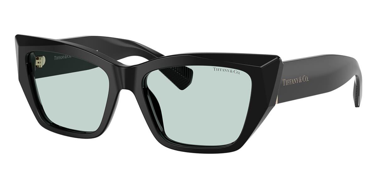 This cat eye Tiffany sunglass comes in a black frame with light azure lenses.