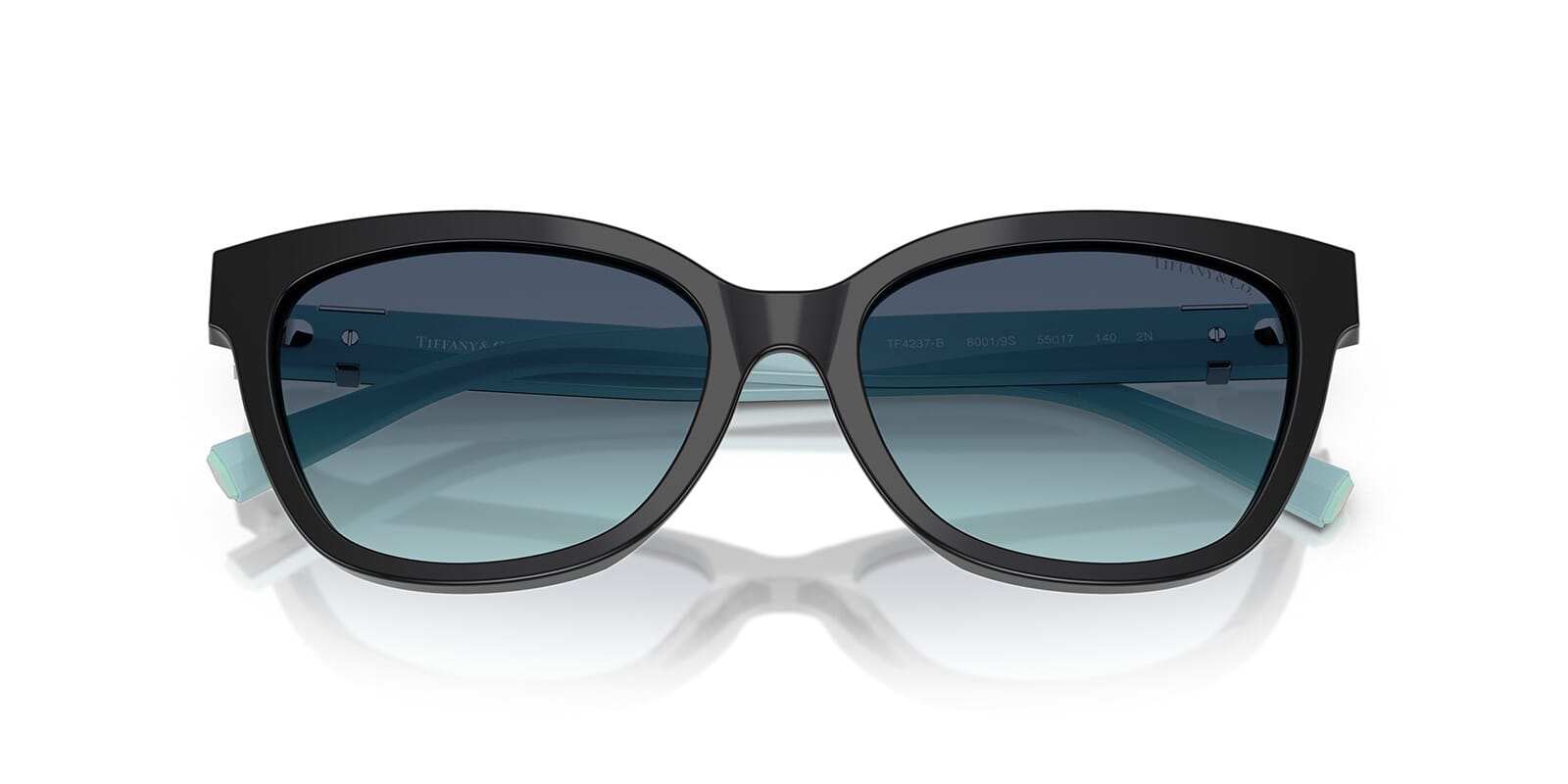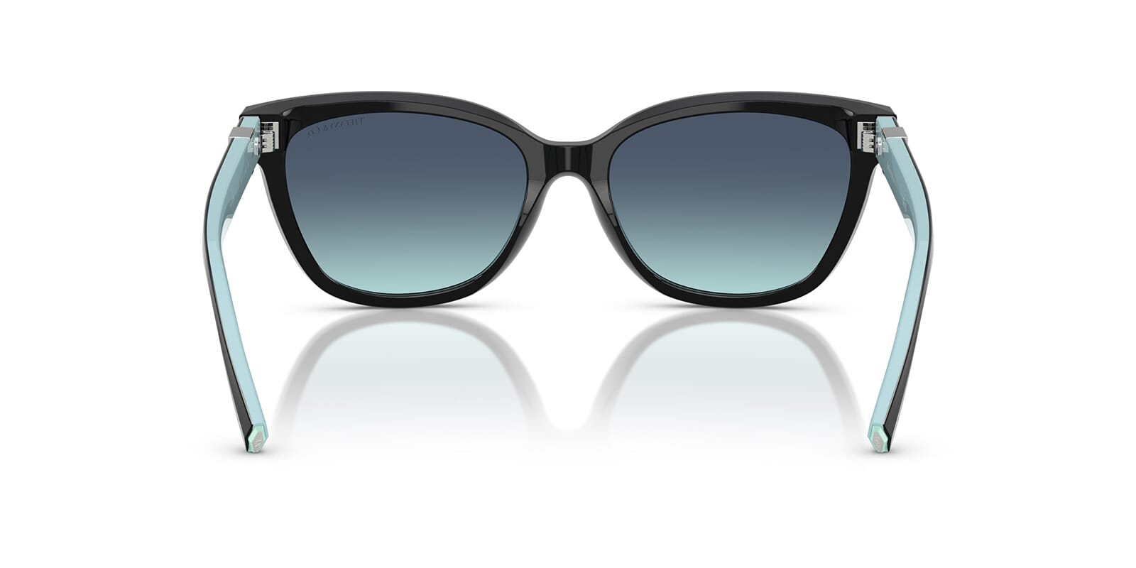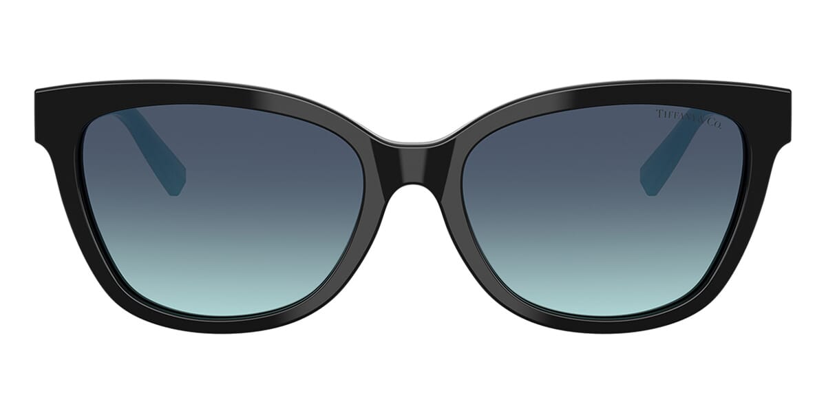 This cat eye Tiffany sunglass comes in a black frame with azure blue gradient lenses.