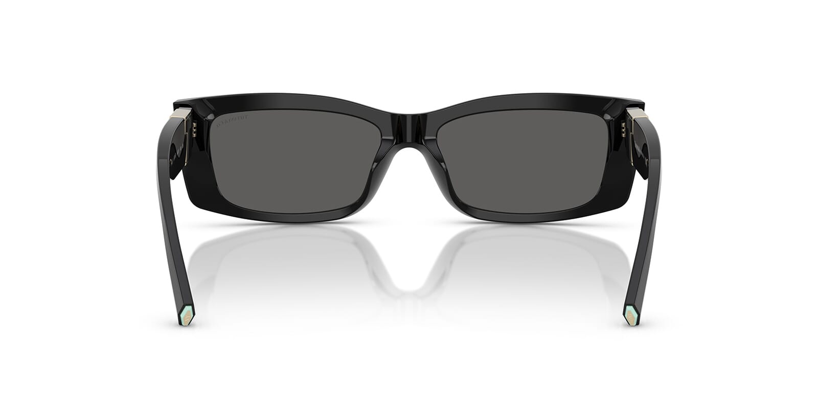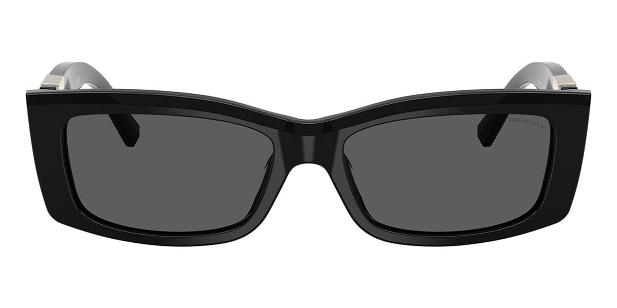 This rectangular Tiffany sunglass comes in a black frame with dark grey lenses.