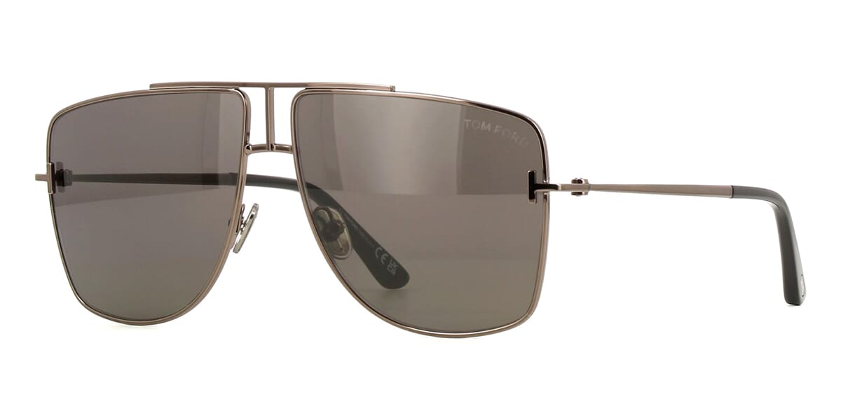 This square Tom Ford sunglass comes in a shiny gunmetal frame with grey with light mirror lenses.