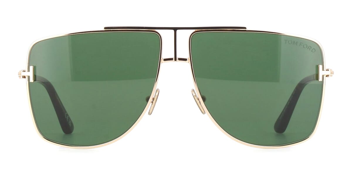 This square Tom Ford sunglass comes in a shiny rose gold frame with dark green lenses.