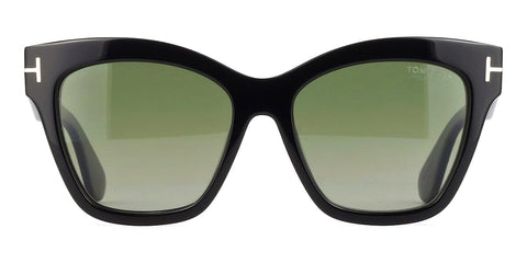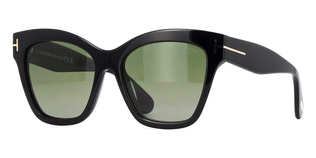 This cat eye Tom Ford sunglass comes in a shiny black frame with green with light mirror polarised lenses.