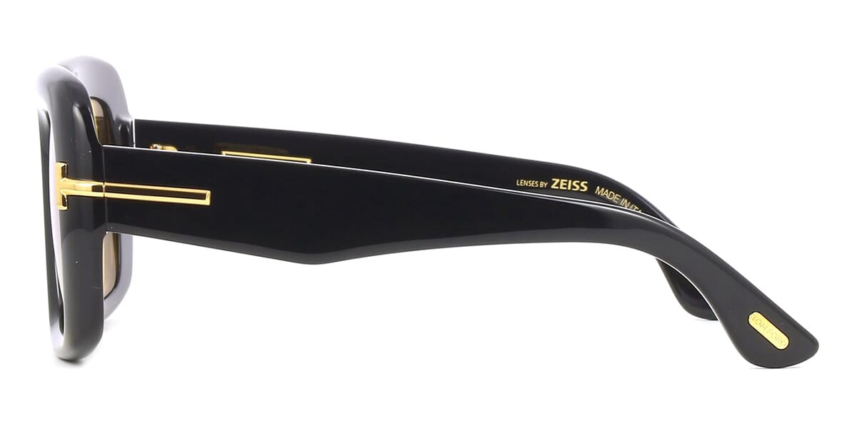This square Tom Ford sunglass comes in a shiny black with gold frame with orange zeiss lenses.