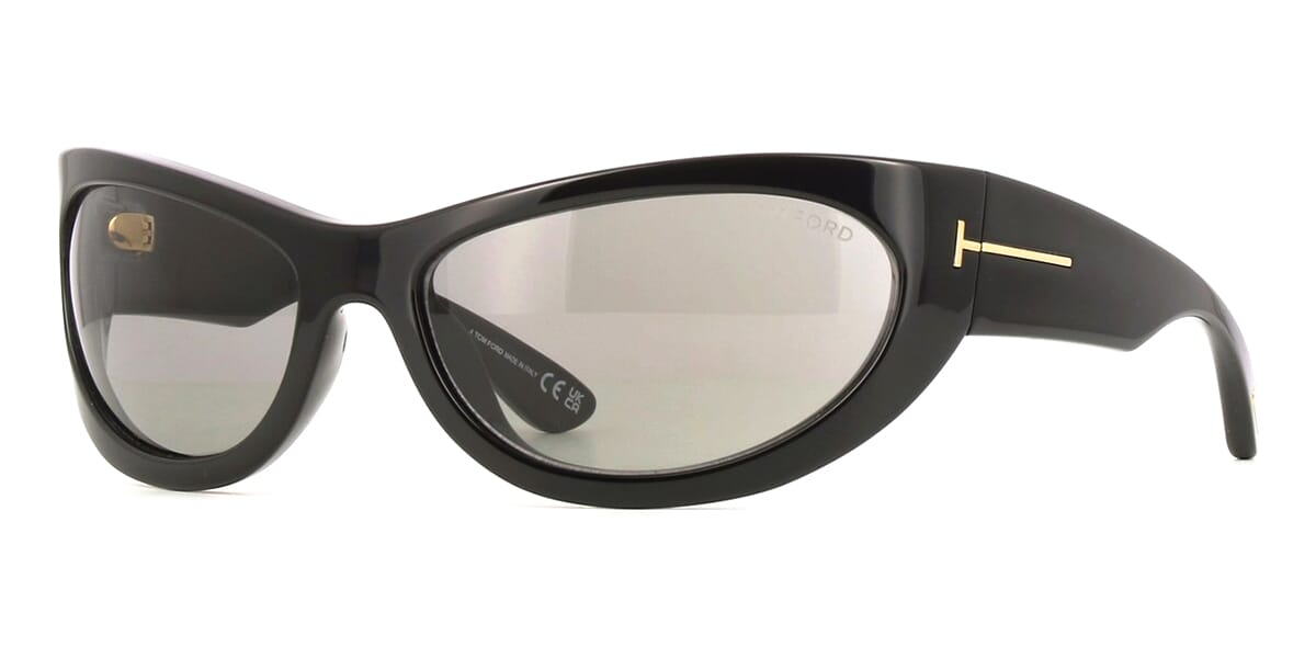 This wraparound Tom Ford sunglass comes in a shiny black frame with light grey lenses.