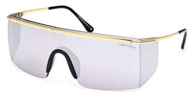 This shield Tom Ford sunglass comes in a shiny gold with black frame with grey smoke lenses.