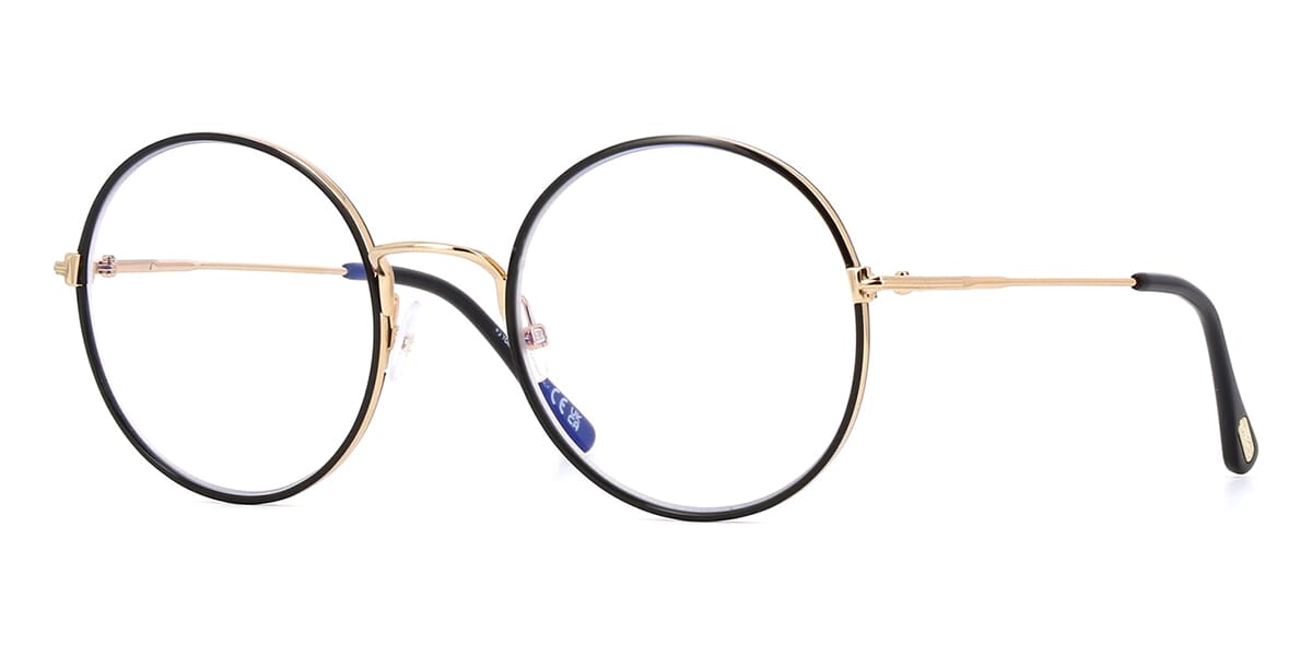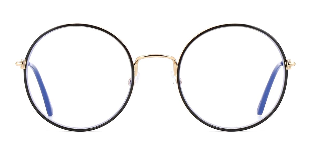 This round Tom Ford optical comes in a shiny black on gold frame.