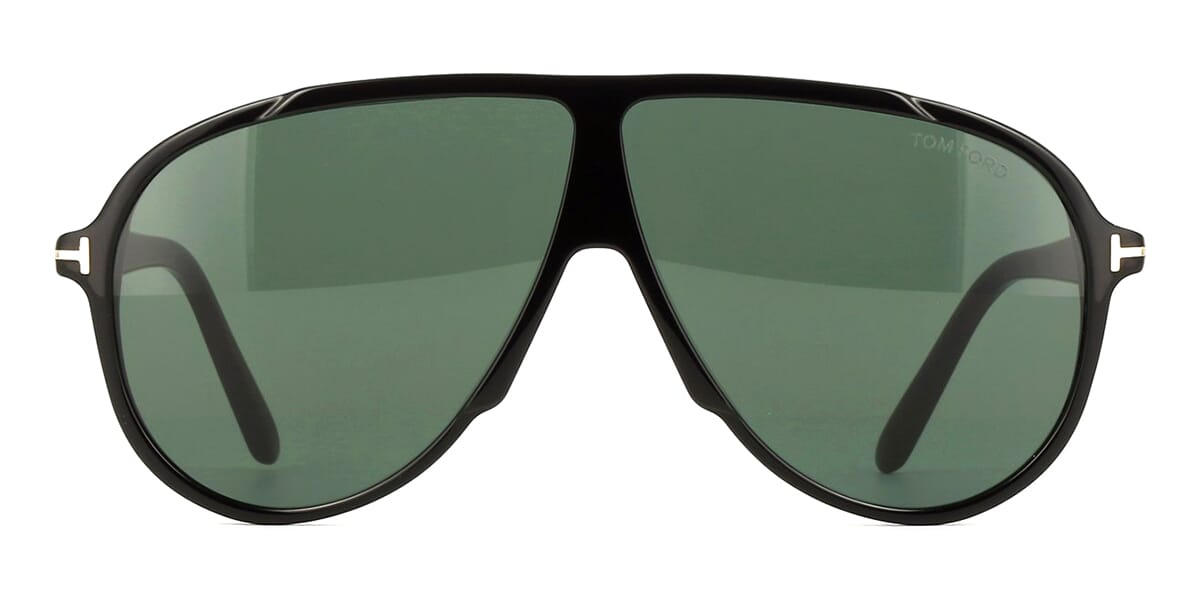 This aviator Tom Ford sunglass comes in a shiny black frame with green with light mirror lenses.
