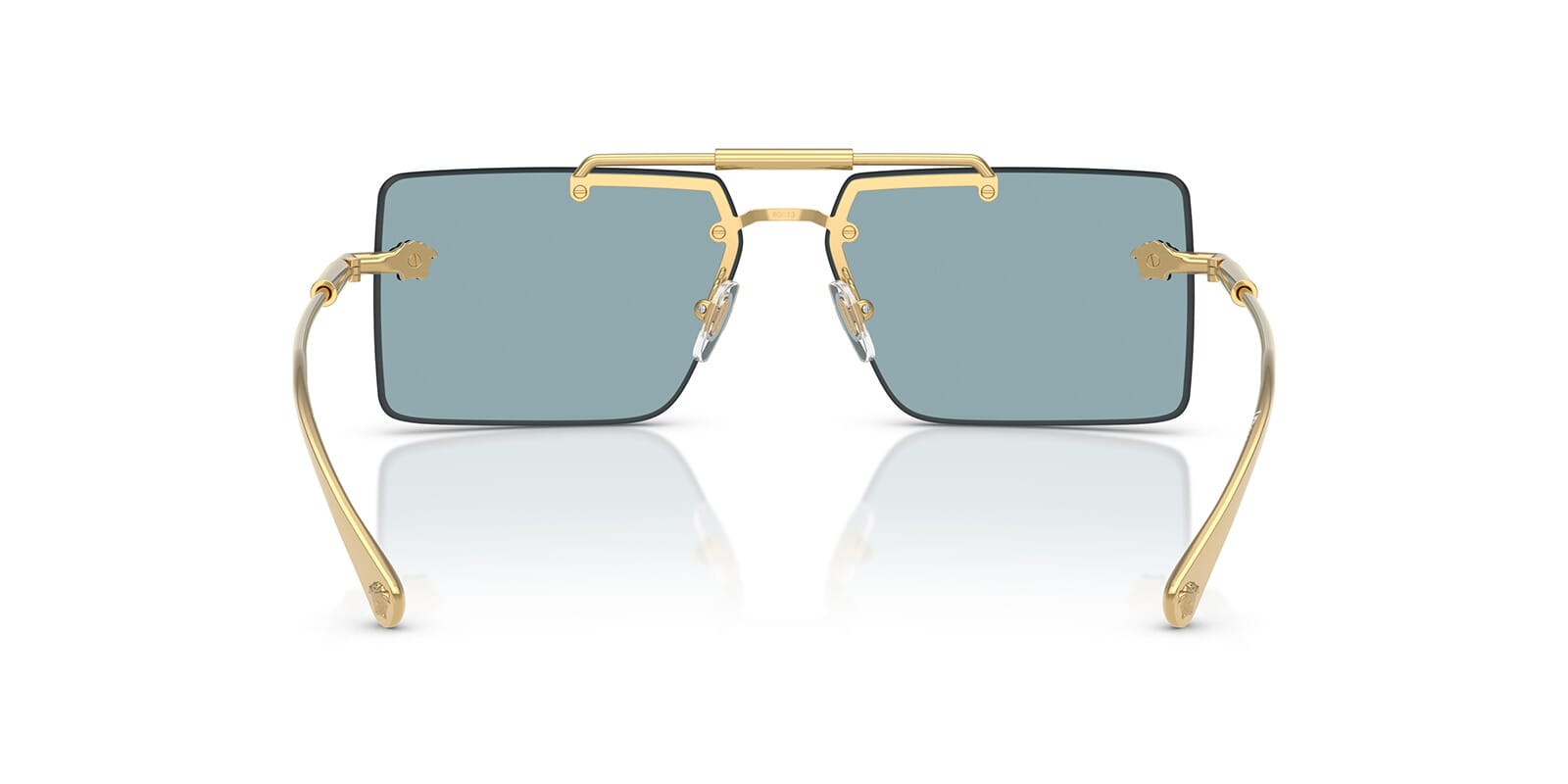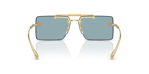 This rectangular Versace sunglass comes in a gold frame with blue lenses.