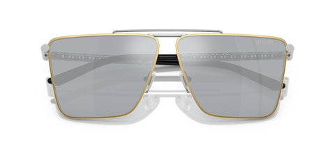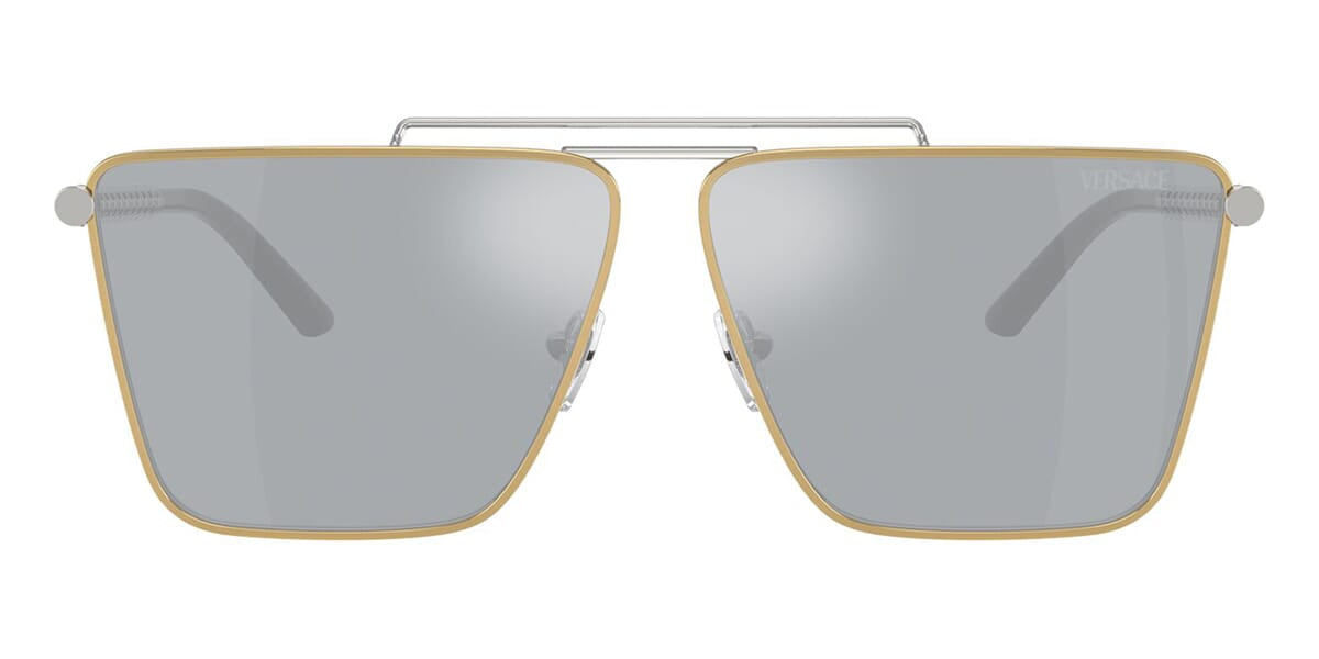 This square Versace sunglass comes in a gold and silver frame with blue with silver mirror lenses.