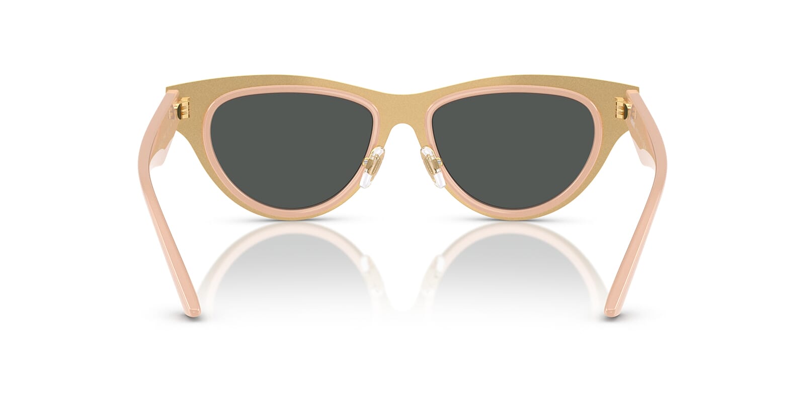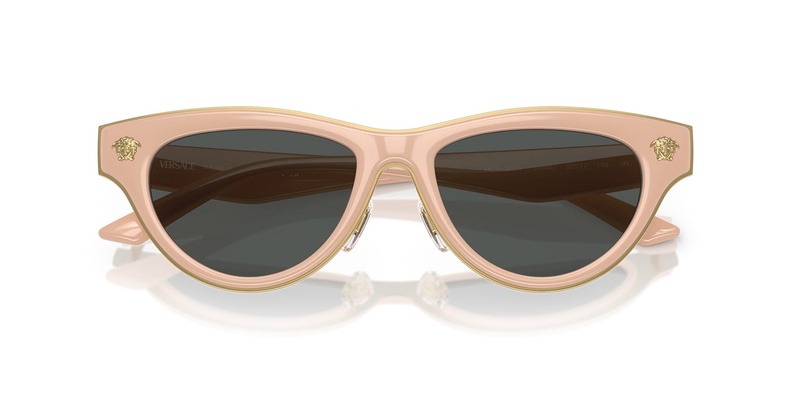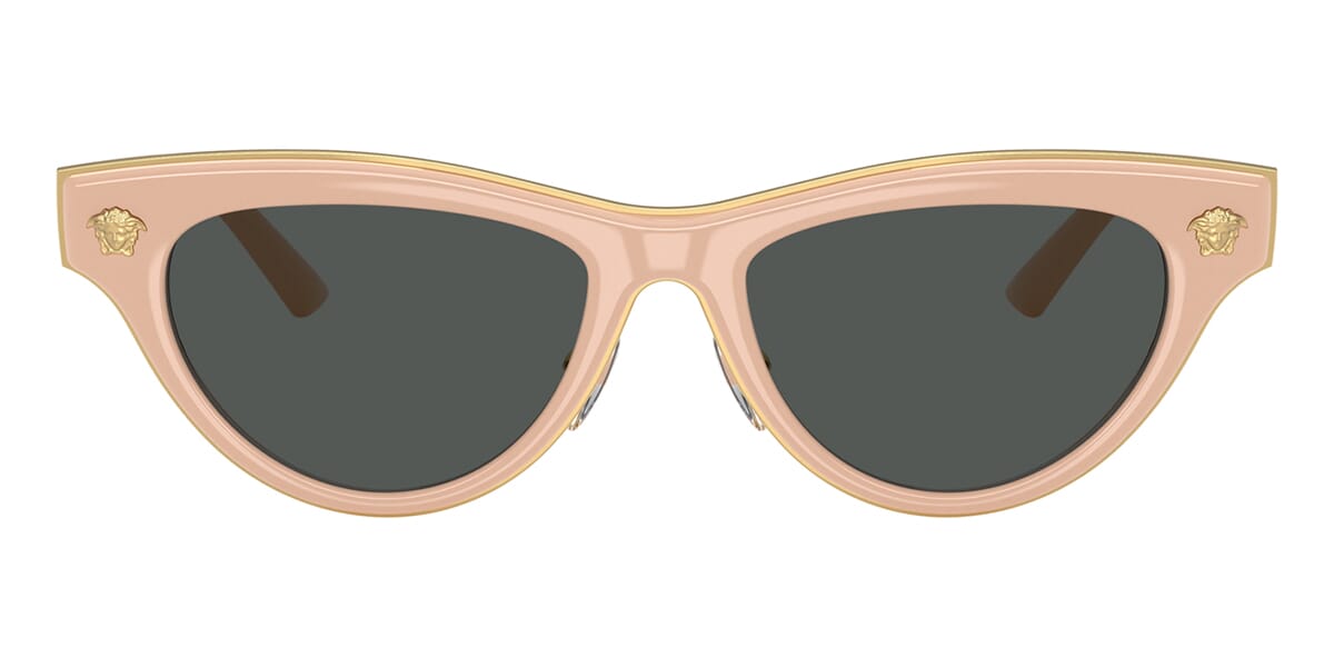 This cat eye Versace sunglass comes in a nude frame with dark grey lenses.
