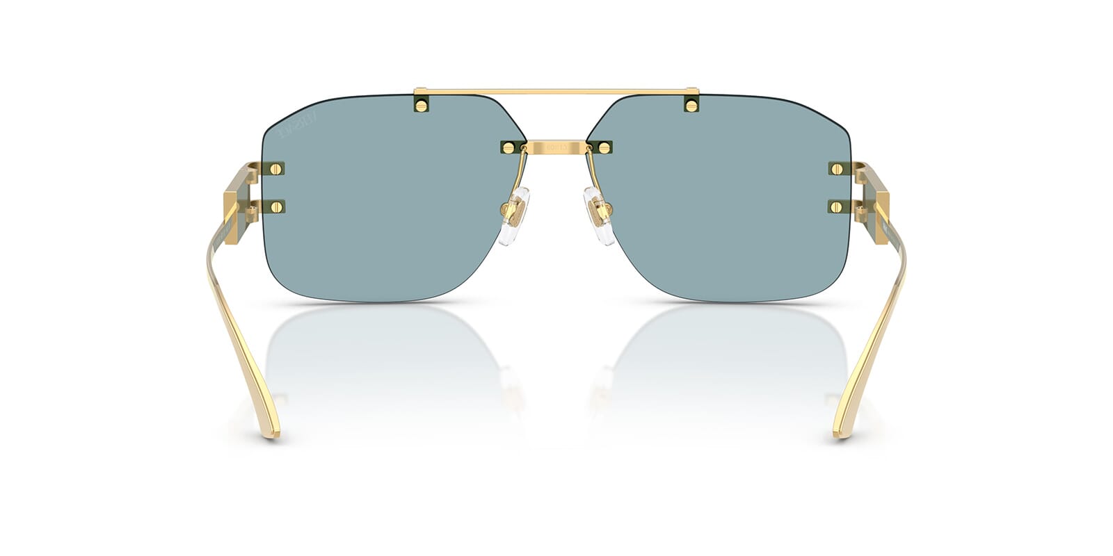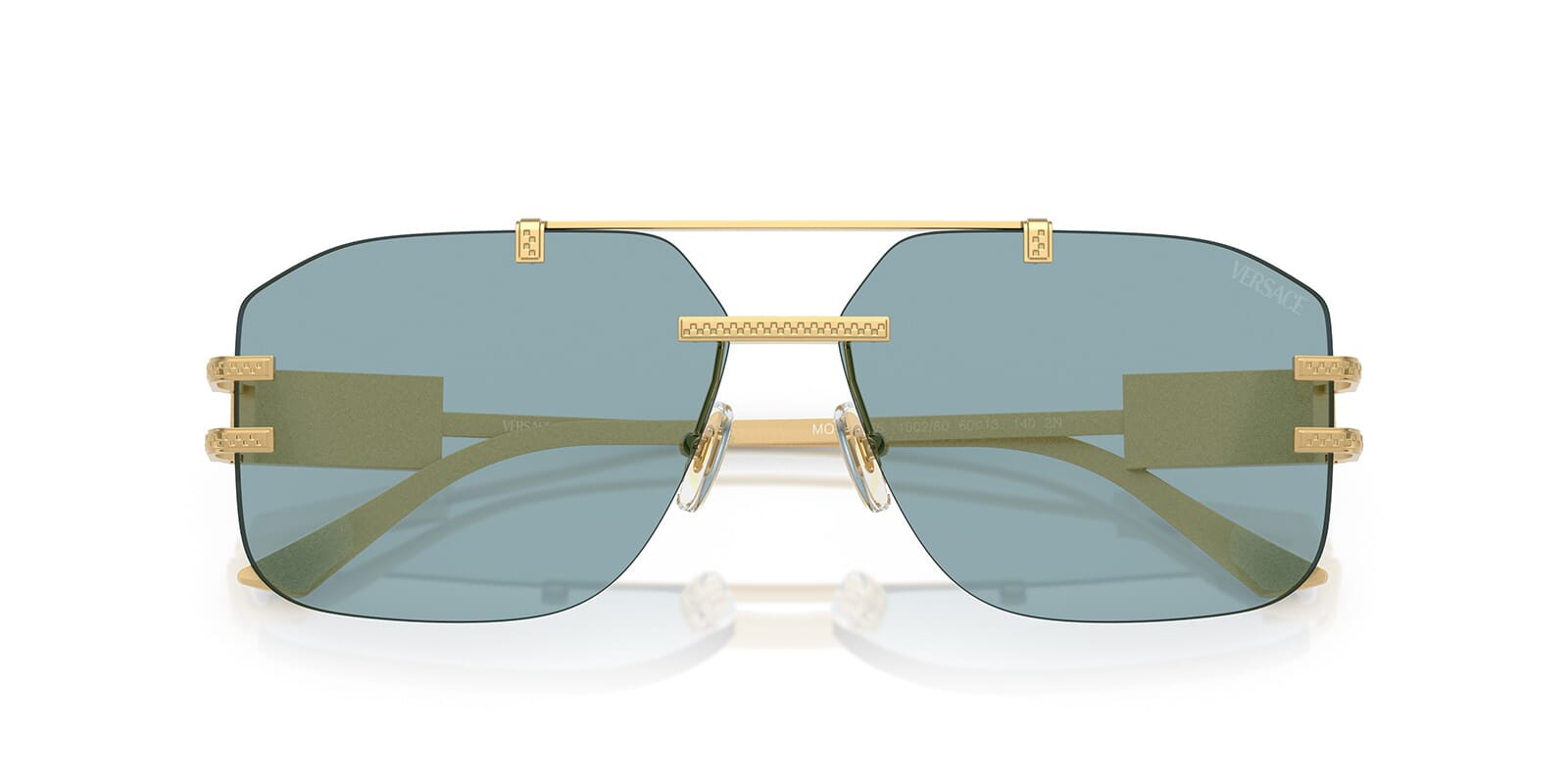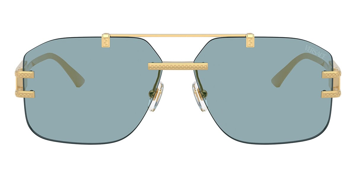 This square Versace sunglass comes in a gold frame with blue lenses.