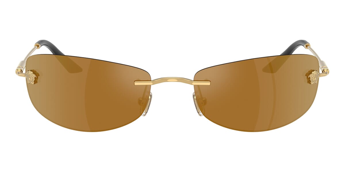 This rectangular Versace sunglass comes in a gold frame with bronze mirror gold lenses.