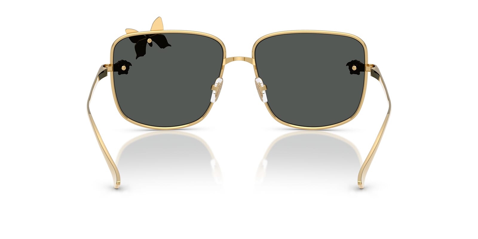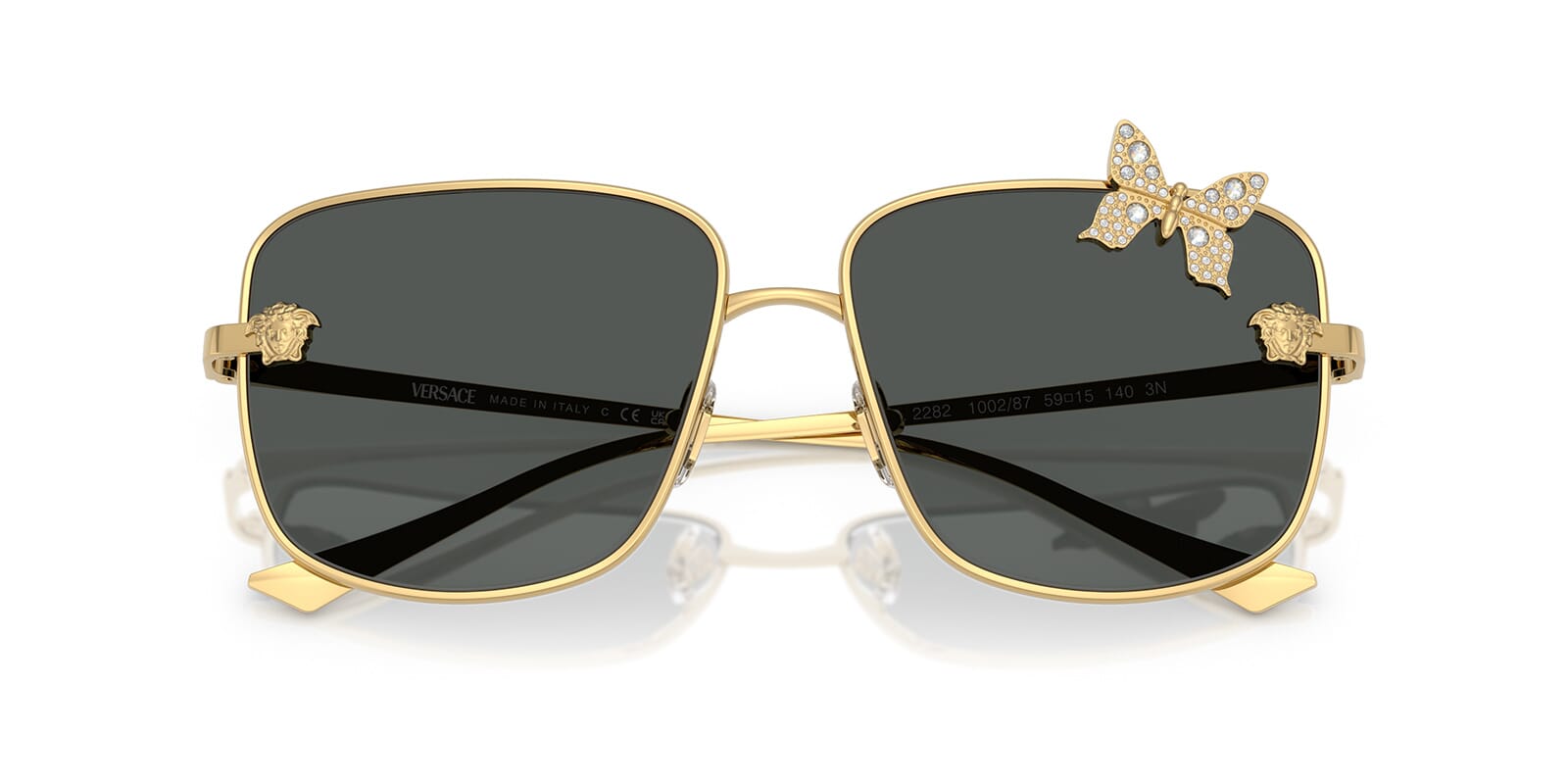 This square Versace sunglass comes in a gold frame with dark grey lenses.