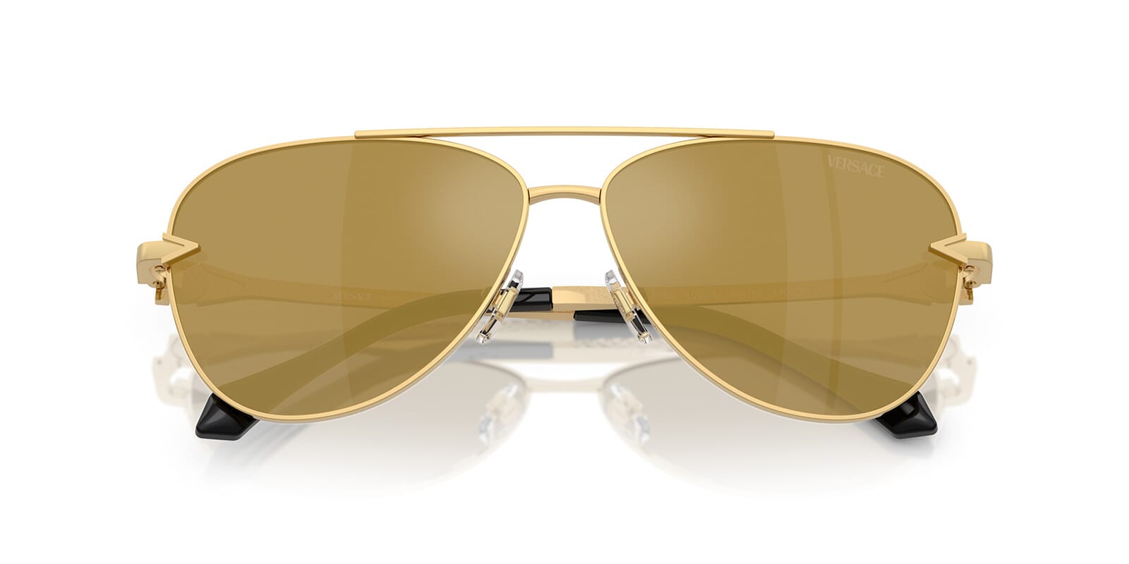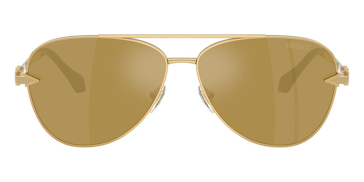This aviator Versace sunglass comes in a gold frame with brown with gold mirror lenses.